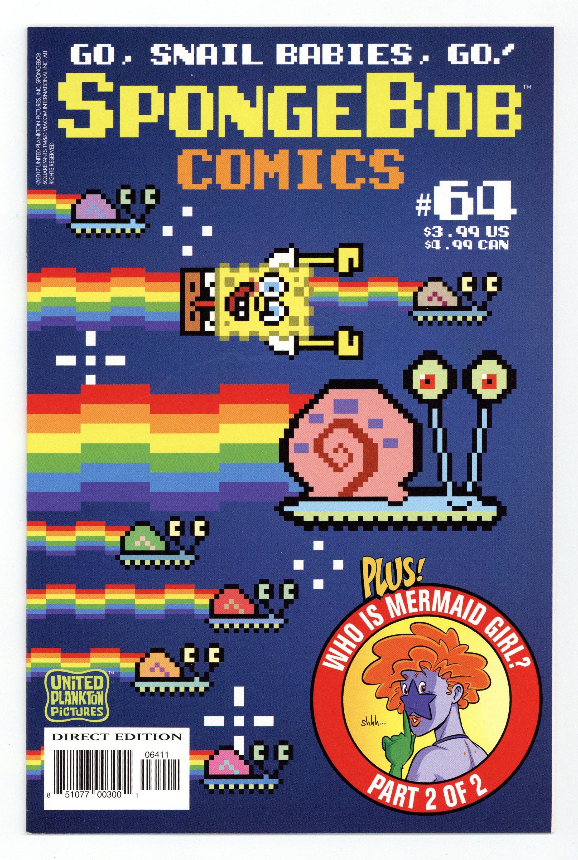 Published Dec 2016 by United Plankton Pictures.$19.50Written by Joey Weiser, Max Davison and Gregg Schigiel. Art by Carolyn Nowak, Scott Roberts and Gregg Schigiel. Cover by Joey Weiser. What's SpongeBob to do when a litter of six baby snails is left meowing and hungry on his pineapple's doorstep? And what's Gary to do when all of SpongeBob's time is taken up by the cuddly critters? Find out in 'Litter Box Blues,' featuring the art of Ignatz Award-nominee Carolyn Nowack. Plus, in 'Who Is Mermaid Girl?' (Part 2), SpongeBob and Sandy are getting closer to the truth about Mermaid Girl's identity - and the final clue lies in a legendary lost episode of the 'Mermaid Man' television show! 32 pages, full color. Cover price $3.99.