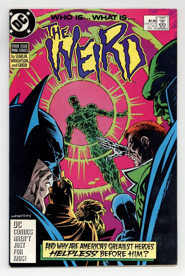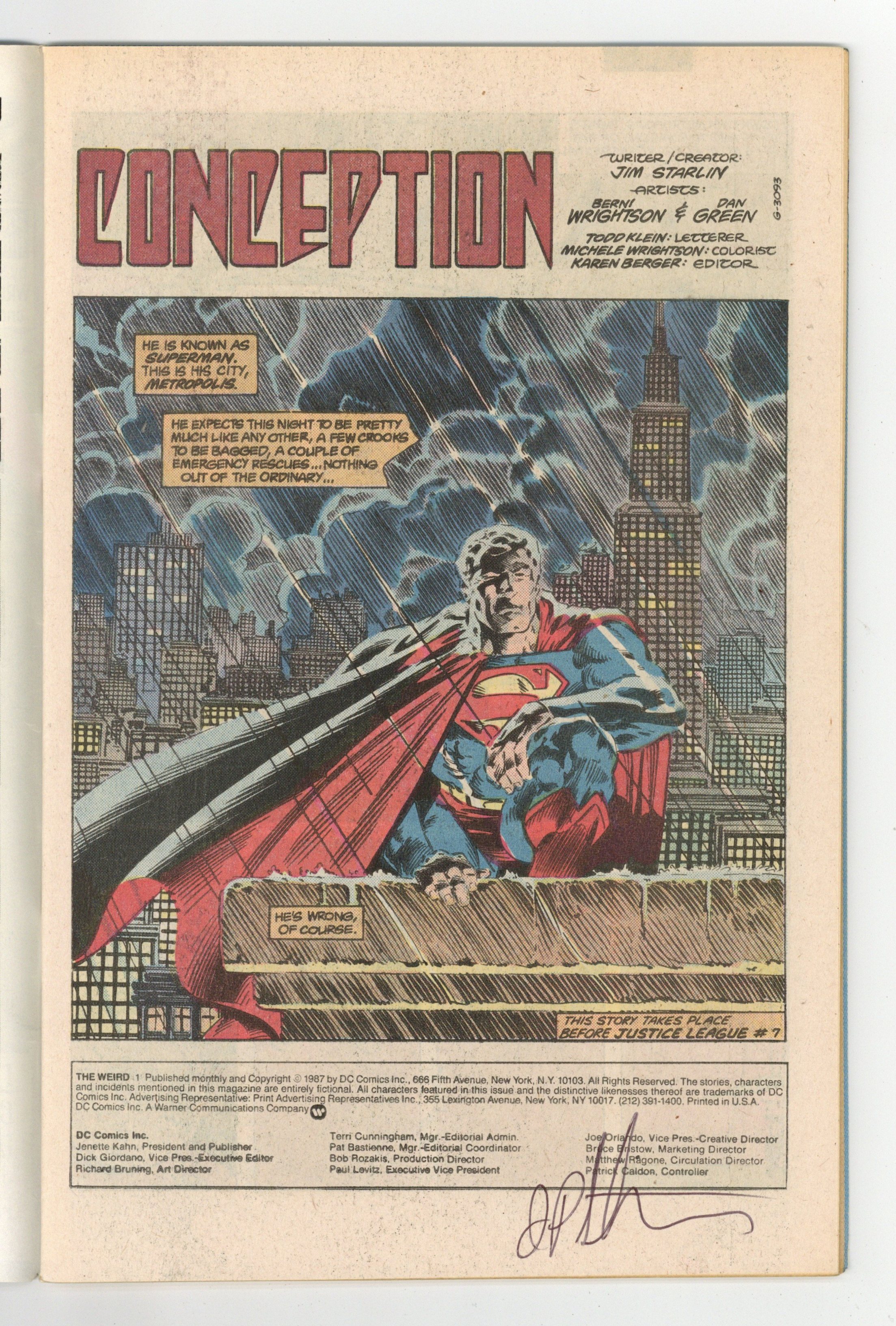 Cover by Berni Wrightson. "Conception," script by Jim Starlin, pencils by Berni Wrightson, inks by Dan Green; Jason Morgan is in his Metropolis apartment bathroom performing a ritual that will create a "bridge" linking his reality to a parallel dimension; Once the bridge is created, a Zarolatt (an energy based sentient being) emerges destroying the link behind him. The Zarolatt flies into the sky where it emits a large flash and noise similar to an explosion and attracting the attention of Superman; He finds a stationary, hovering wave of energy; After a preliminary examination, Superman attempts to touch it and is blasted about three miles away; By the time he returns Captain Atom and the Martian Manhunter of the newly formed Justice League are present. 52 pgs., full color. $1.50. Cover price $1.50.