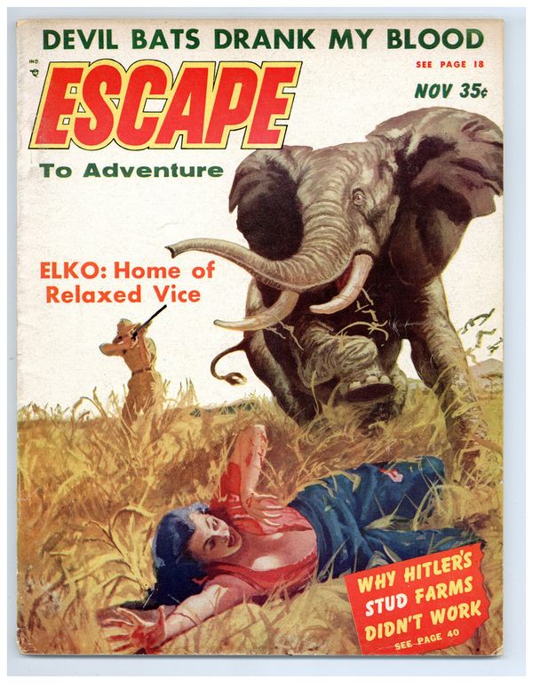 Volume 1 Issue 2 - November, 1957. Men's adventure magazines focusing adventures stories and pictorials. This issue features "Devil Bats Drank my Blood!", "Elko Home of Relaxed Vice" and "Why Hitler's Stud Farms Didn't Work!" 8 1/4-in. x 11-in., 84 pages, B&W Cover price $0.35.