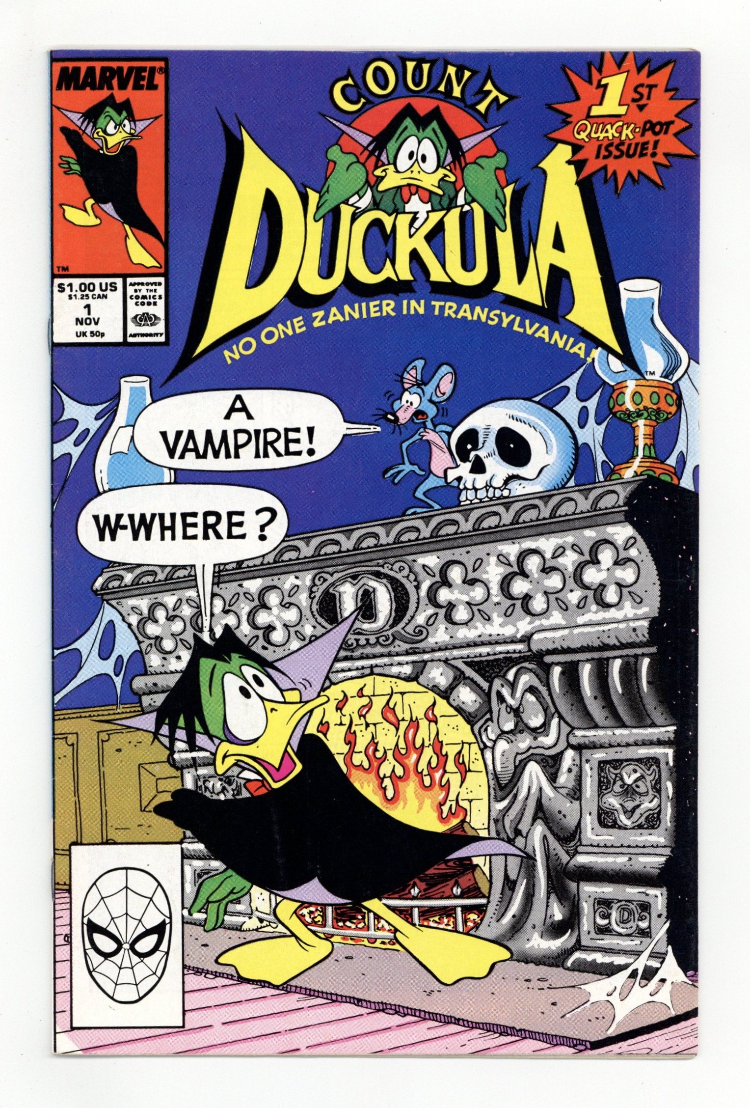Comic book version of the animated series which originally aired in the late 1980s. Igor creates a new vampire to roam the halls of Castle Duckula but he messes up and creates a vegetarian vampire, Count Duckula who would rather eat salad instead of blood and play some music. But Dr. Von Goosewing, the world's greatest vampire hunter, is on his trail in "A Minor Fowl-Up." And then Count Duckula decides to try to become a movie star and travels to Hollywood to do so in "Lights! Camera! Traction!" Scripts by Michael Gallagher and art by Warren Kremer. Cover price $1.00.