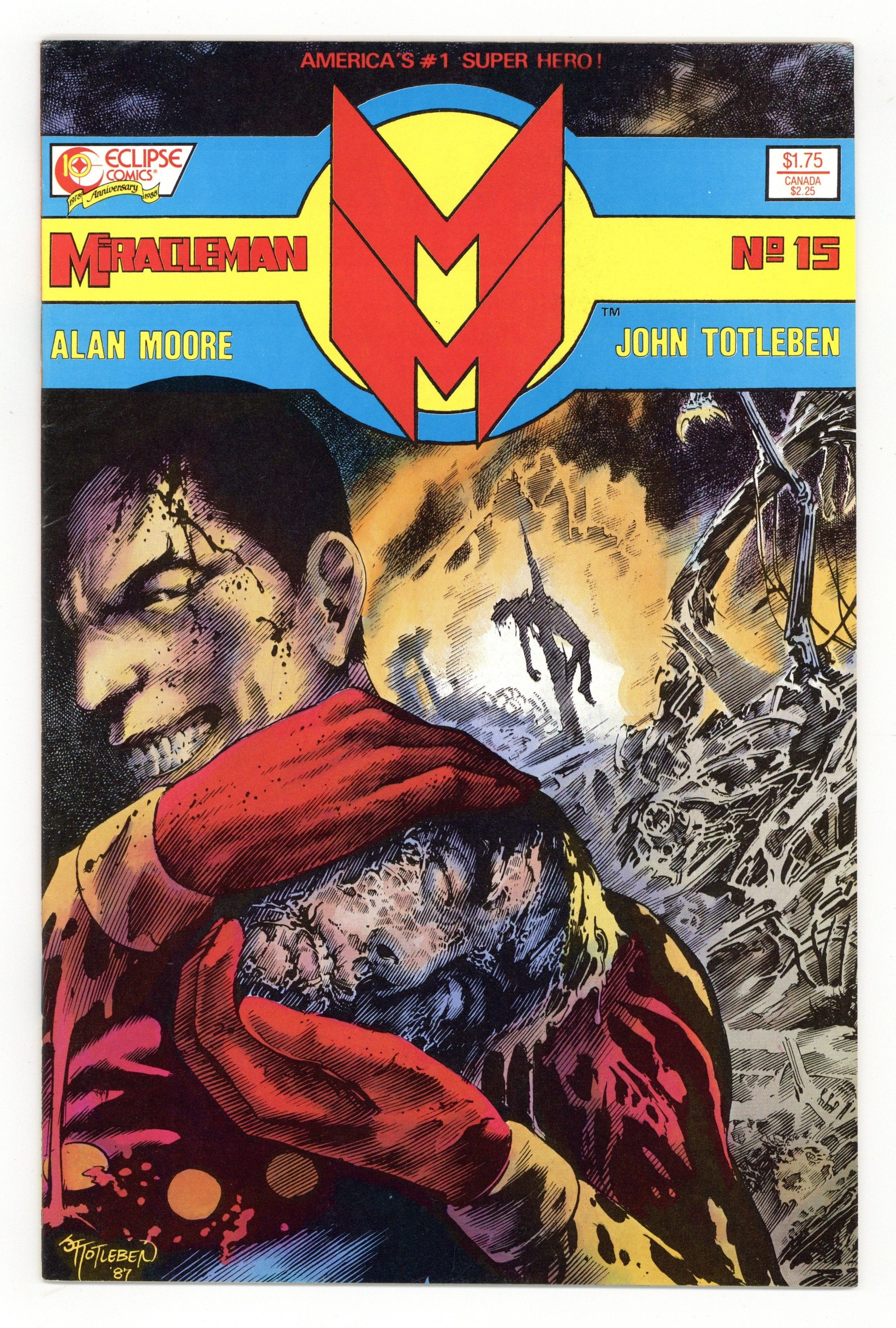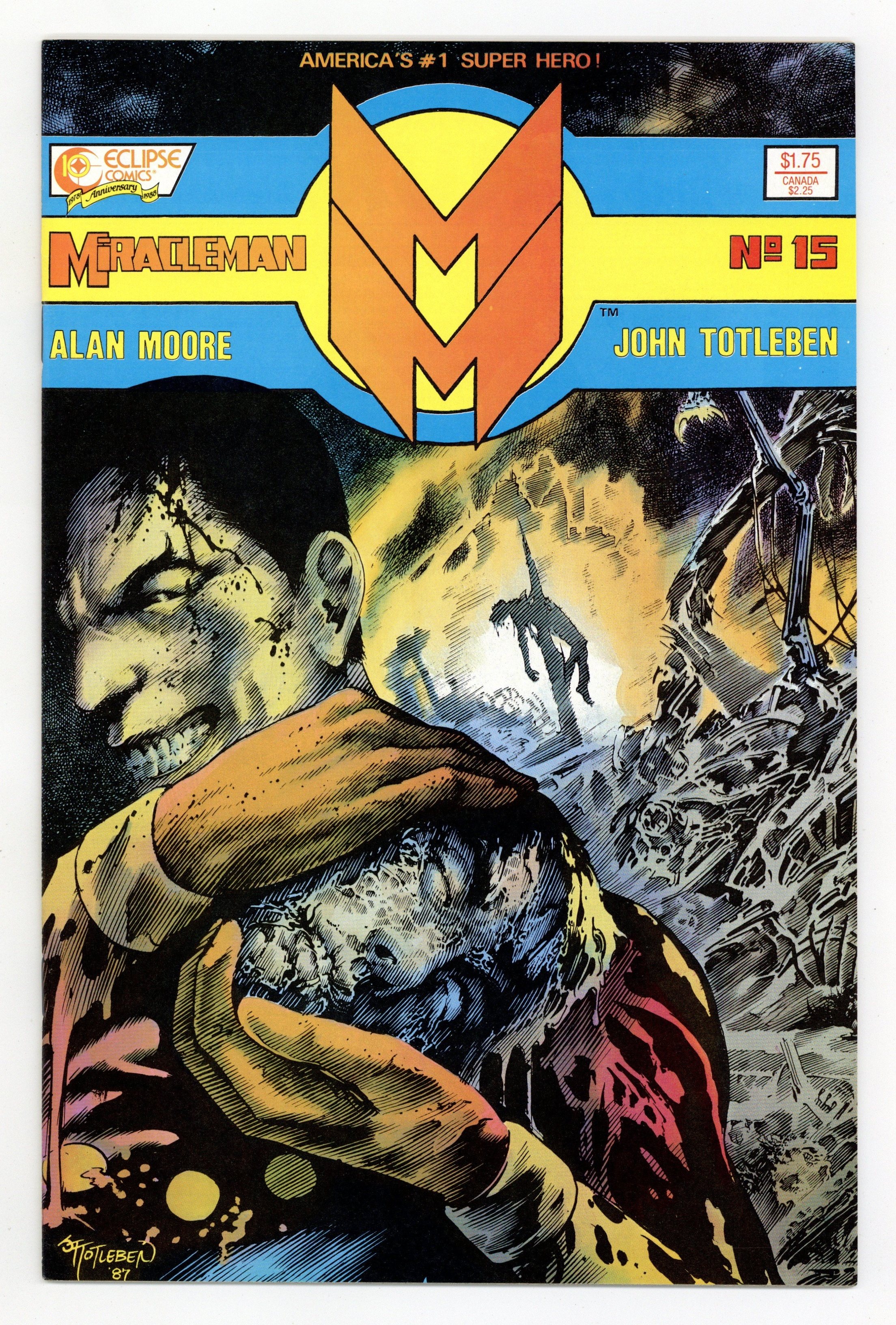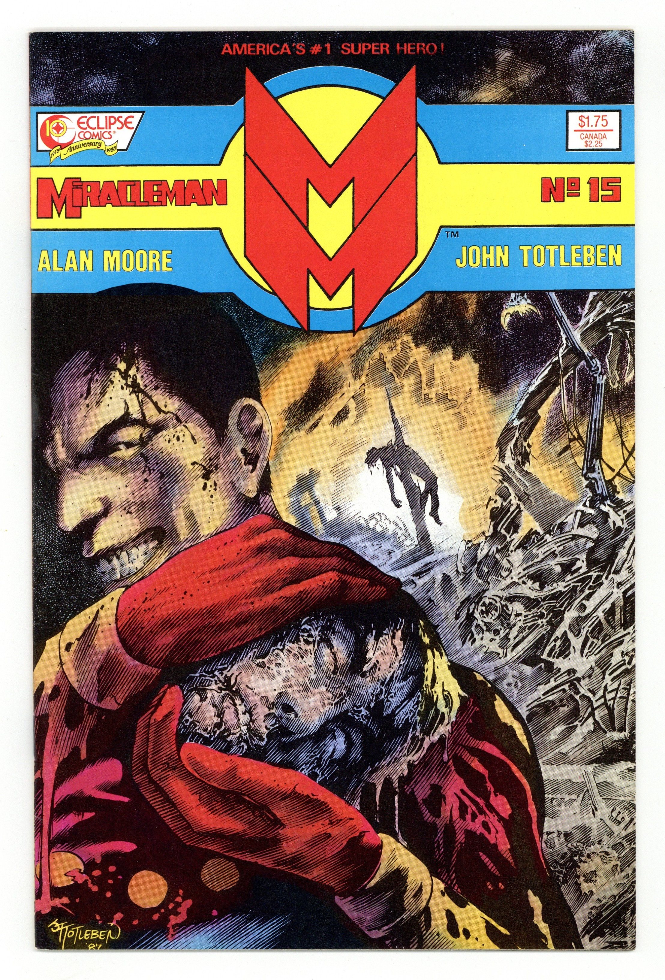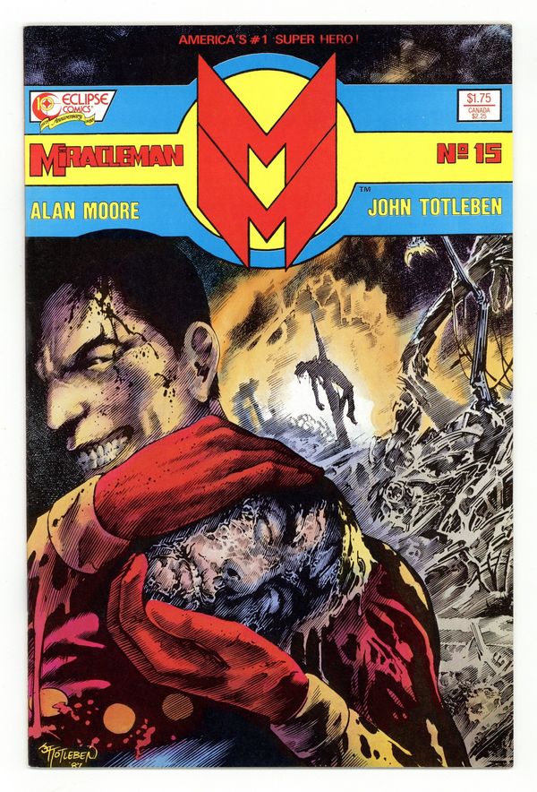 Alan Moore script, John Totleben art. "Book Three, Chapter Five: Nemesis." This sought-after issue features the end of Kid Miracleman and quite possibly the most horrific super-battle in the history of comics. Also features a five page back-up, "Miracleman and the Rock of Eternity," a reprint from Mic Anglo Studios' Amazing New Adventures of Marvelman #305 (circa 1955). Cover price $1.75.