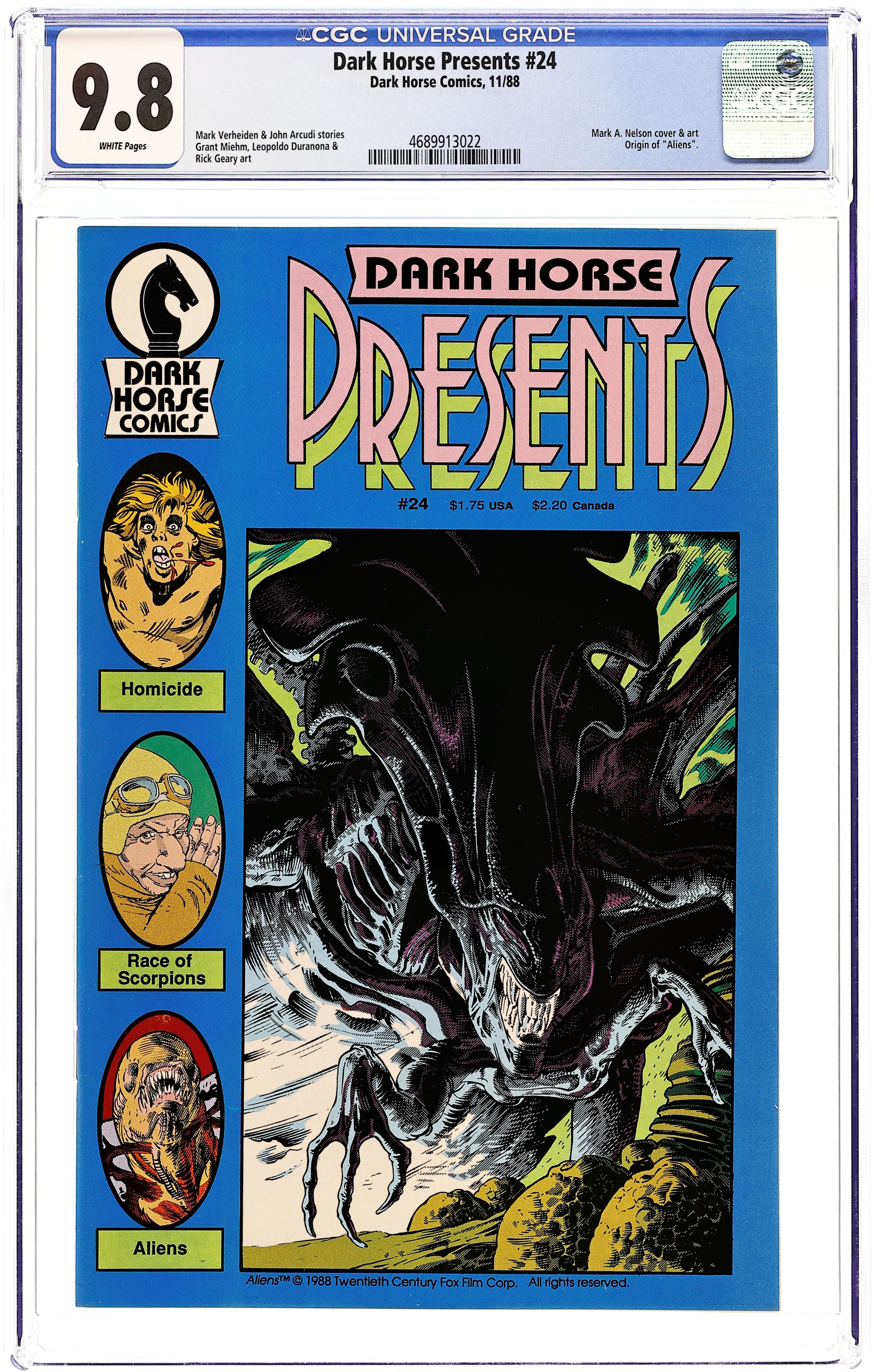 Cover by Mark A. Nelson. Writer Mark Verheiden and artist Mark A. Nelson present an all-new "side bar" story to Dark Horse's ongoing Aliens miniseries as they take us inside the mind of an Alien Queen! Plus-Just in time for Halloween, Kull writer John Arcudi and The American artist Grant Miehm team up on a tale of murder and...cannibalism in the wilds of New York. And Leopoldo Duranona continues his exciting five-part science fiction epic Race of Scorpions. 32 pages, B&W. Cover price $1.75.