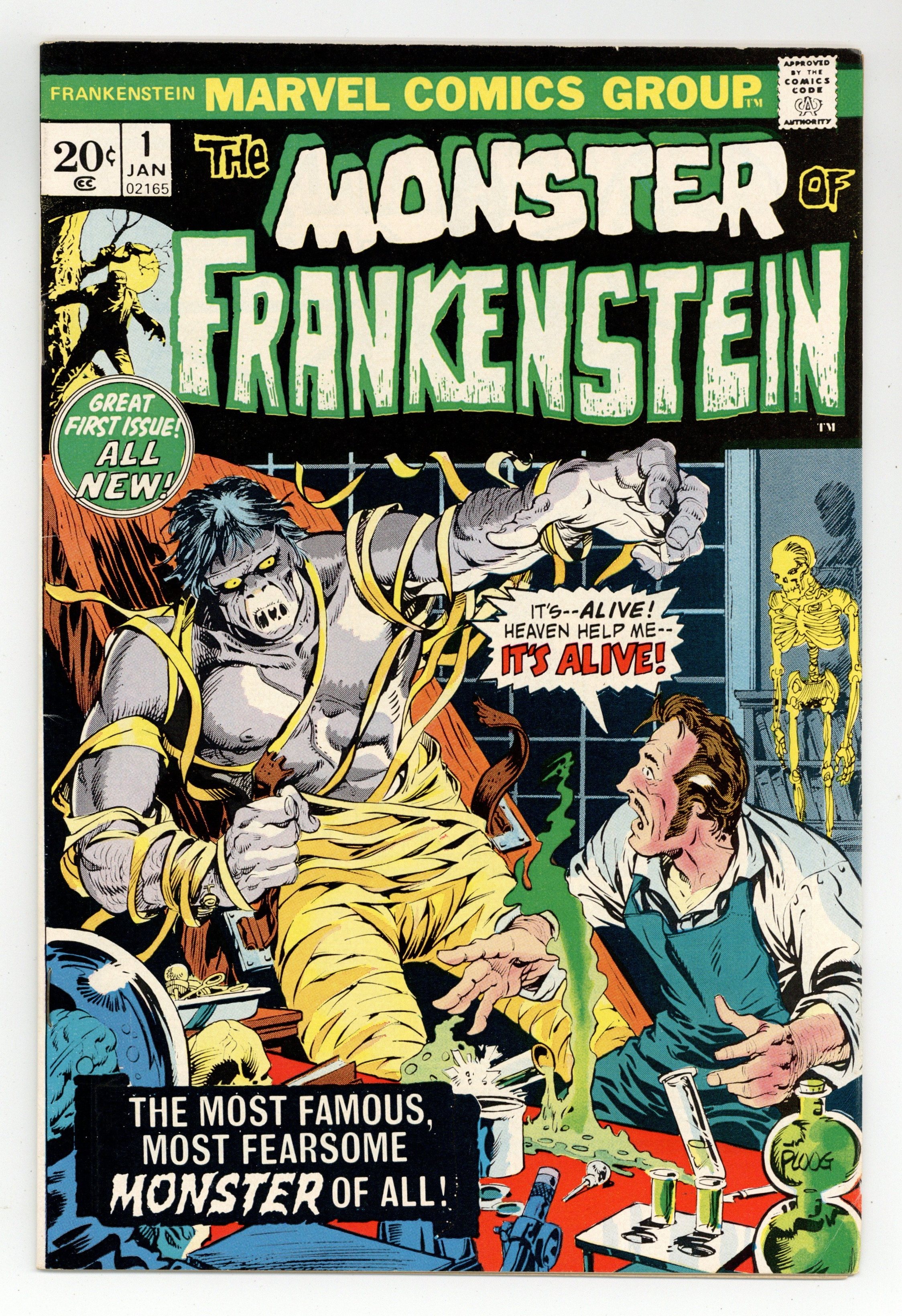 Marvel begins its own unique take on the Frankenstein mythos by, in essence, continuing the Mary Shelley story--beginning with the discovery of the monster frozen in ice and bringing it back to life! "Mary Shelley's Frankenstein!" Script by Gary Friedrich, early classic art and cover by Mike Ploog. Cover price $0.20.