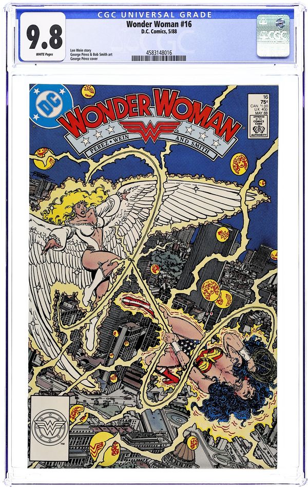 The Silver Swan's motives come to light, as she and Wonder Woman battle over the sea in "Bird of Paradise/Bird of Prey!" Part 2 of 2, continued from the previous issue. Some story elements continue into Superman #17, Adventures of Superman #440 and Action Comics #600. Script by Len Wein, plot and layouts by George Perez, finishes by Bob Smith. Perez cover. 36 pgs. Cover price $0.75.