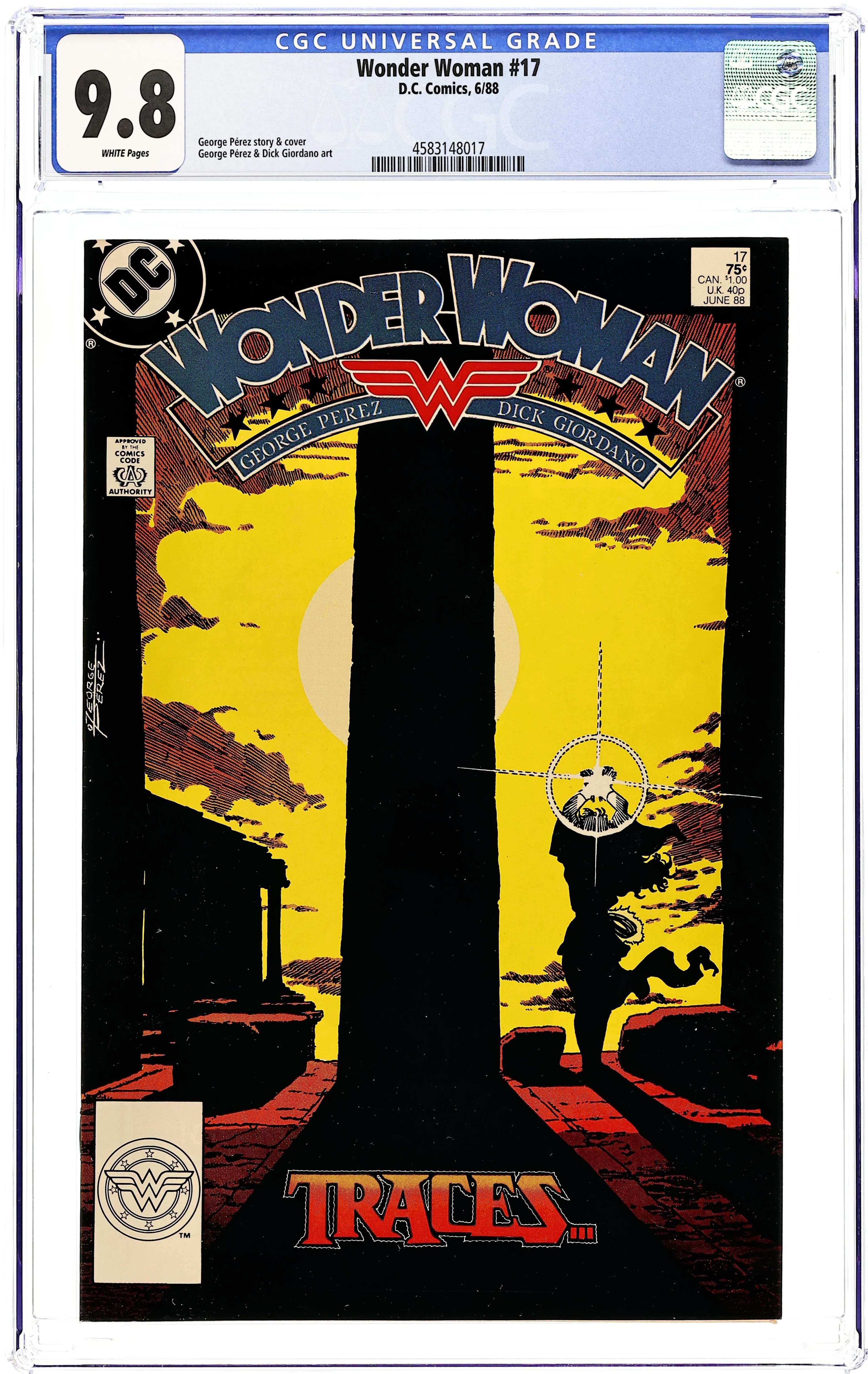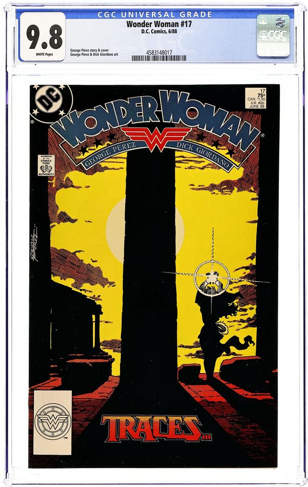 Diana and Vanessa head to Greece to meet up with Julia, the gods face Olympus' fate, and a mystery woman observes Diana in "Traces". Part 1 of 3, continued next issue. Script and pencils by George Perez, finishes by Dick Giordano. Perez cover. 36 pgs. Cover price $0.75.