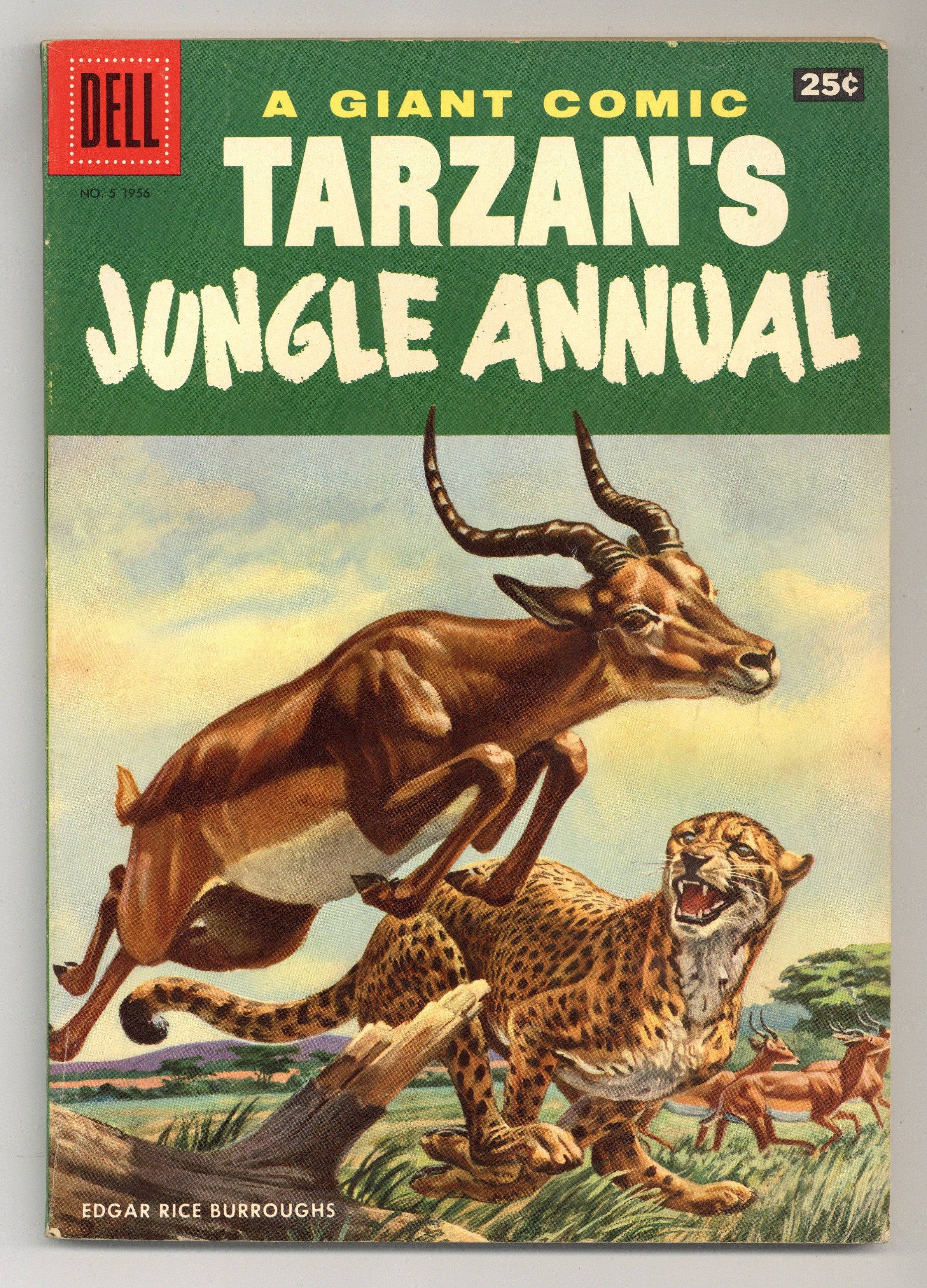 $16.00Painted cover art by Moe Gollub. Tarzan and the City of Silence," script by Gaylord Du Bois, art by Jesse Marsh; Tarzan goes to Tohr, the City of Silence, to rescue Ta-den, the king of Alur. Tarzan's Birds illustration by Jesse Marsh. "Tarzan and the Tall Warriors," script by Gaylord Du Bois, art by Russ Manning; Tarzan and Buto explore a valley inhabited by the descendants of Vikings. The Game of Hazards activity, art by Tony DiPaola. "The Ordeal of the Spears," script by Gaylord Du Bois, art by Jesse Marsh; A witch doctor equipped with a bullet-proof vest sets out to make himself king of Africa. "Desert Ambush," script by Gaylord Du Bois, art by Jesse Marsh; Tarzan escorts an Arab village leader, bearing gold, to and from the market. "Lie Detector of Zululand" text story, art by Tony DiPaola. The Hidden Terror activity page, art by Tony DiPaola. "Boy Saves the Day," script by Gaylord Du Bois, art by Nat Edson; Boy and Isilio rush to find Muviro and a hunting party when invaders attack the Waziri village. Boy and Dombie Cutout page. Bantu Boys at Play article. "The Courage of M'Bogo," script by Gaylord Du Bois, art by Nat Edson; M'bogo leads his heard in driving away a pride of lions. Jungle Theater activity. "Mabudu Money" one-page story, art by Tony DiPaola. Tarzan's Ape-English Dictionary, art by Tony DiPaola. Spiny Pets illustration by Jesse Marsh. Painted Tarzan on Elephant illustration on back cover. 100 Pages, Full Color. Cover price $0.25.