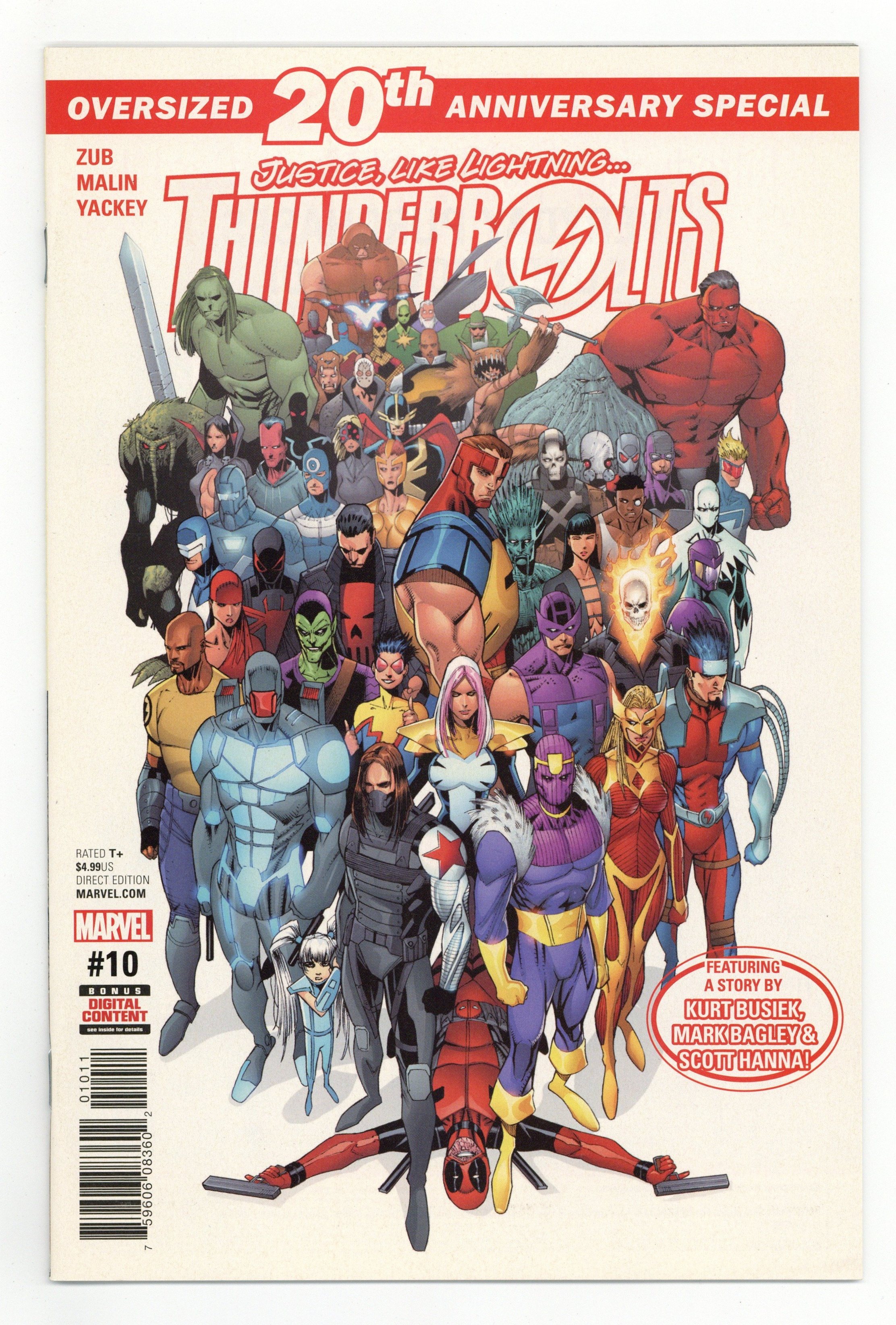 Return of the Master: Part 1 - Written by Jim Zub and Kurt Busiek. Art by Jon Malin and Mark Bagley. Cover by Jon Malin. 20TH ANNIVERSARY ISSUE! Once upon a time the Thunderbolts were the Masters of Evil…and if Baron Zemo has his way, their legacy will be reclaimed…with the infinite power of a Cosmic Cube! Captain America's sinister plan for Bucky and Kobik begins to unfold. 'Return of the Masters,' the Thunderbolts 20th anniversary event, begins here! Along with our pulse-pounding lead story, this special oversized issue includes a brand-new Thunderbolts tale by series co-creators Kurt Busiek and Mark Bagley! 36 pages, full color. Rated T+ Cover price $4.99.
