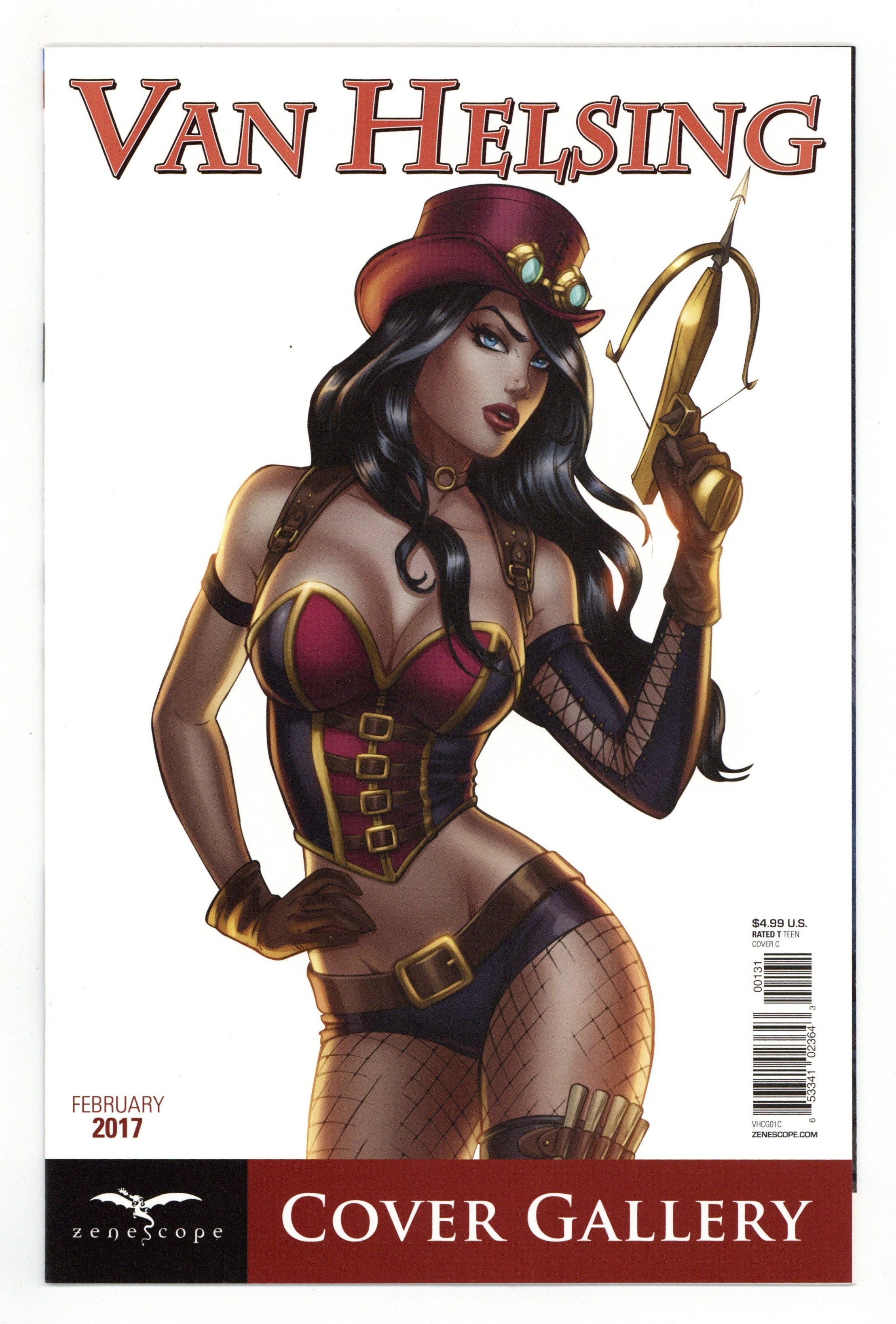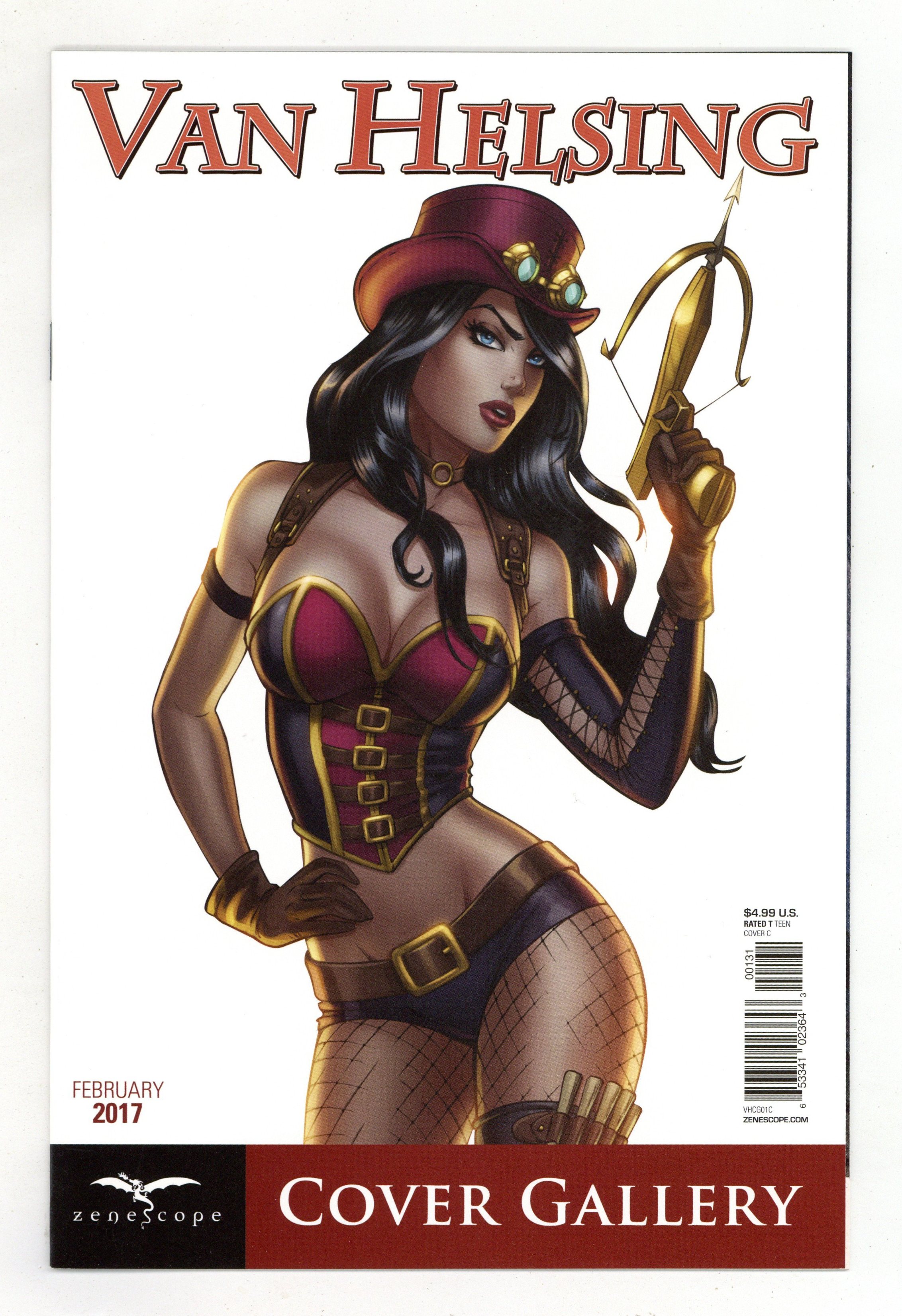 Published Feb 2017 by Zenescope Entertainment.$18.00Cover by Dawn McTeigue and Sabine Rich. The comic book series that inspired SyFy's new hit TV series, VAN HELSING, finally releases its very first cover gallery issue! Liesel Van Helsing, Zenescope's British steampunk vampire hunter, is one of comics' most iconic and stylistic heroines. And some of the best comic book artists in the industry have drawn her to perfection. With artwork by names such Jamie Tyndall, Richard Ortiz, Paul Green, Sean Chen, and many others, this insanely gorgeous Van Helsing Cover Gallery is a must-have for any fan! 32 pages, full color. Rated T Cover price $4.99.