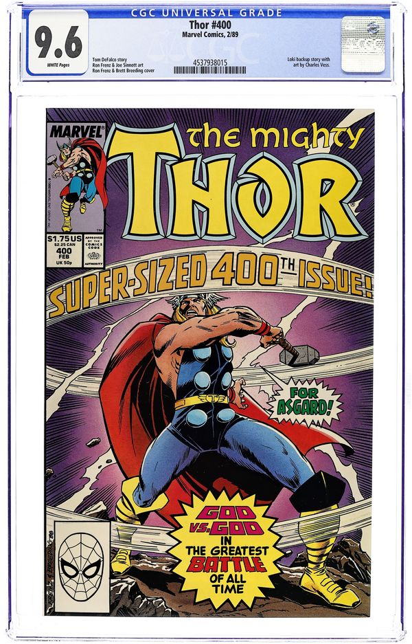 War of Gods: Part 6 of 6 - 64-page giant; Thor battles Surtur in "Lest Heavens Perish!" Script by Tom DeFalco, pencils by Ron Frenz, inks by Joe Sinnott. Appearances by Sif, Balder, Karnilla, Volstagg, Fandral, Heimdall, Sif, Odin, the Earth Force, Hogun, the Black Knight, and the Enchantress. Four back-up stories: "I...This Hammer!" Script by DeFalco, pencils by Frenz, inks by Brett Breeding. Hulk cameo. "When Volstagg Was in Flower!" Script by DeFalco, plot by Frenz, pencils by Rich Yanizesky, inks by Mark McKenna. Appearances by Hogun and Fandral. Hercules guest stars in "When Warriors Clasp!" Script byDeFalco and Frenz, pencils by Gary Hartle, inks by Don Heck. Finally, the origin of Loki in "Evil Aborning." Script by Randall Frenz, art by Charles Vess. Sif pin-up by John Workman/Joe Sinnott. Thor/Captain America/Beta Ray Bill/Dargo pin-up by Frenz/Breeding. Sif/Jane Foster/Enchantress/Hela/Lorelei pin-up (uncredited). Cover price $1.75.