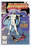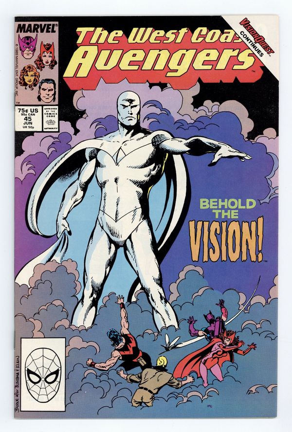 Tags: Avengers$60.00Vision Quest Part 4 of 4. "New Faces" Script by John Byrne. Pencils by John Byrne. Inks by Mike Machlan. Cover by John Byrne. The Vision has been reassembled thanks to the brilliance and hard work of Hank Pym. But complications remain. First, the Vision's appearance has changed due to the trauma his bio-synthetic skin suffered during his disassembly. And second, while Hank has restored the Vision's memories, he can't recreate the emotional attachment to them. For that the brain patterns of Simon Williams are needed. But when Wanda finds Simon and asks him to cooperate, he refuses. Then Wonder Man faces the wrath of the Scarlet Witch! Wow, the West Coast Avengers are approaching rock bottom. And the recent addition of the U.S. Agent is not helping. (Notes: The cover to this issue is an homage to John Buscema and George Klein's classic cover to Avengers (1st series) #57 -- the first appearance of the silver age Vision. The white Vision debuted in the MCU in the final episode of the WandaVision Disney+ series. The Vision Quest storyline was a distressing read for long-time fans of the Avengers. Several years later during the Gatherers saga, the Vision regains his red-hued body. [See Avengers 360.] The letters page contains a statement of ownership: average print run 306,775; average paid circulation 178,125.) 32 pages. Cover price $0.75.