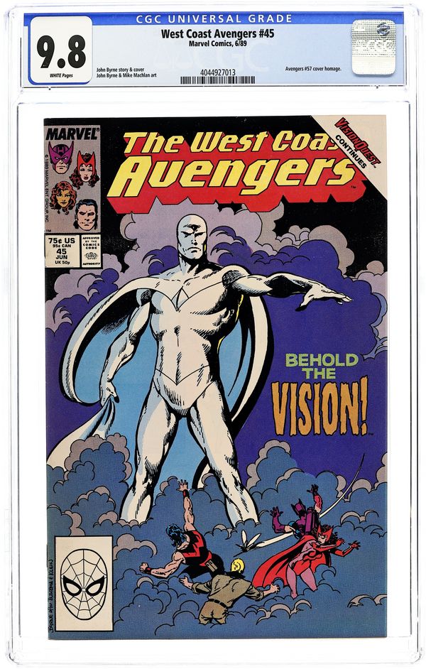 Vision Quest Part 4 of 4. "New Faces" Script by John Byrne. Pencils by John Byrne. Inks by Mike Machlan. Cover by John Byrne. The Vision has been reassembled thanks to the brilliance and hard work of Hank Pym. But complications remain. First, the Vision's appearance has changed due to the trauma his bio-synthetic skin suffered during his disassembly. And second, while Hank has restored the Vision's memories, he can't recreate the emotional attachment to them. For that the brain patterns of Simon Williams are needed. But when Wanda finds Simon and asks him to cooperate, he refuses. Then Wonder Man faces the wrath of the Scarlet Witch! Wow, the West Coast Avengers are approaching rock bottom. And the recent addition of the U.S. Agent is not helping. (Notes: The cover to this issue is an homage to John Buscema and George Klein's classic cover to Avengers (1st series) #57 -- the first appearance of the silver age Vision. The white Vision debuted in the MCU in the final episode of the WandaVision Disney+ series. The Vision Quest storyline was a distressing read for long-time fans of the Avengers. Several years later during the Gatherers saga, the Vision regains his red-hued body. [See Avengers 360.] The letters page contains a statement of ownership: average print run 306,775; average paid circulation 178,125.) 32 pages. Cover price $0.75.