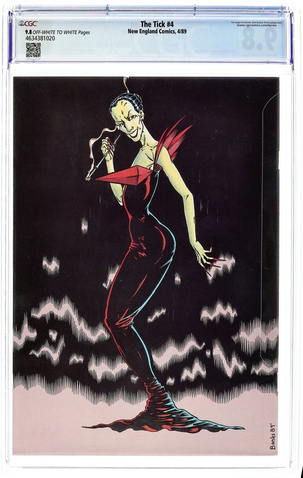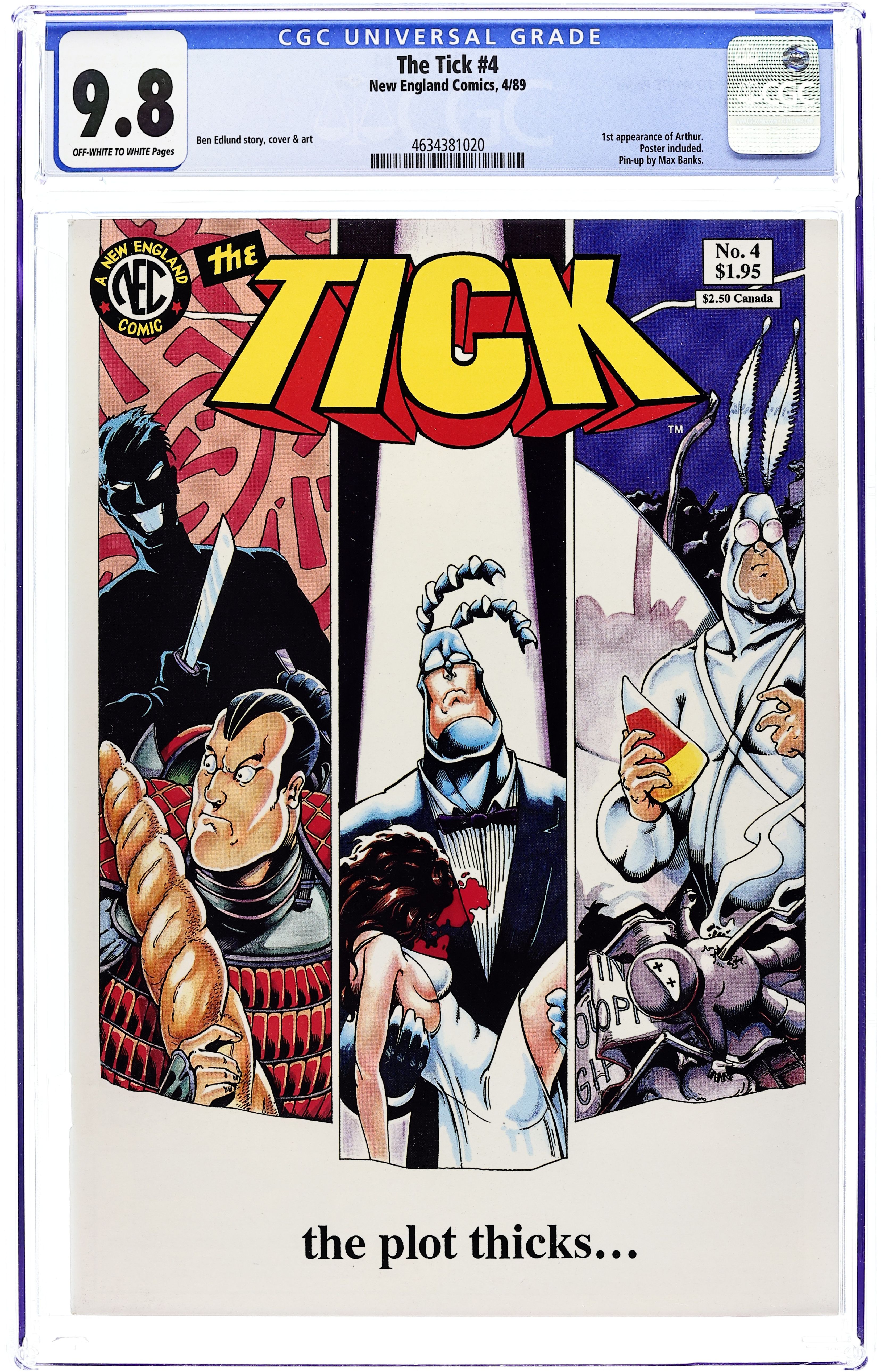First printing. NOTE: This is a 1st Printing. 1st printings do not have a 2nd or later printing notice in indica. Written by Ben Edlund. Art and cover by Ben Edlund and Max Banks. 1st appearance of Paul The Samurai. Tick and Oedipus are attacked at her parents' dinner party by a group of ninjas. After Oedipus is injured, Tick has a crisis of sanity and decides the best thing to do is destroy Ninja World. Which he does. Conflict ensues over the Thorn of Destiny and Tick comes close to losing it until Arthur shows up to make sense of a few things. Paul the Samurai trails his enemy Sagin from Japan and prepares to take him down with a loaf of deadly French bread. Centerfold poster of an interior splash page.44 pgs., B&W. $1.95. Cover price $1.95.