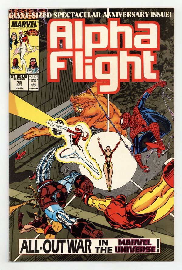 Giant-Size Anniversary Issue. "Tigers in the Rain!" Part 5 of 5. Story by James D. Hudnall. Art by John Calimee and Mike Manley. It's all-out war in the Marvel Universe! Trapped on an alternate Earth, Alpha Flight fights for their lives against alternate versions of the greatest heroes in the universe. Featuring appearances by alternate versions of the Avengers, Fantastic Four, Hulk, and X-Men. Cover price $1.95.