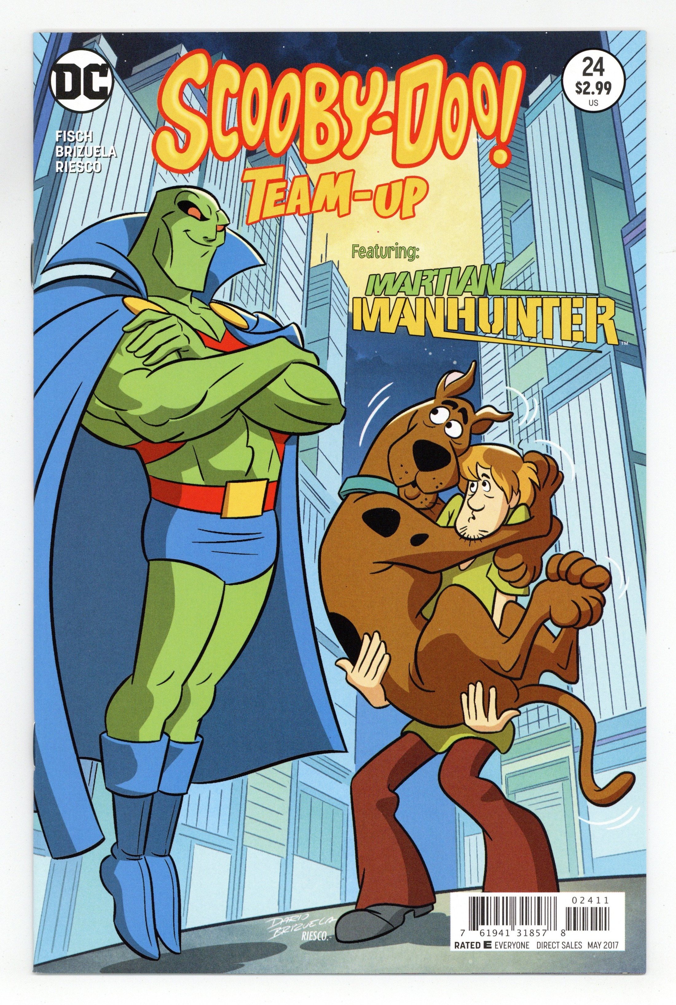 Written by Sholly Fisch. Art and Cover by Dario Brizuela. An unknown warlord calls for all aliens to rise up against the Earthlings, which means bad news for dozens of heroes. It's up to the Martian Manhunter, Scooby and the gang to expose the truth before every alien hero on Earth is rounded up by the mysterious Men in Plaid! 32 pages, full color. Rated E Cover price $2.99.