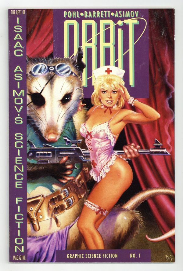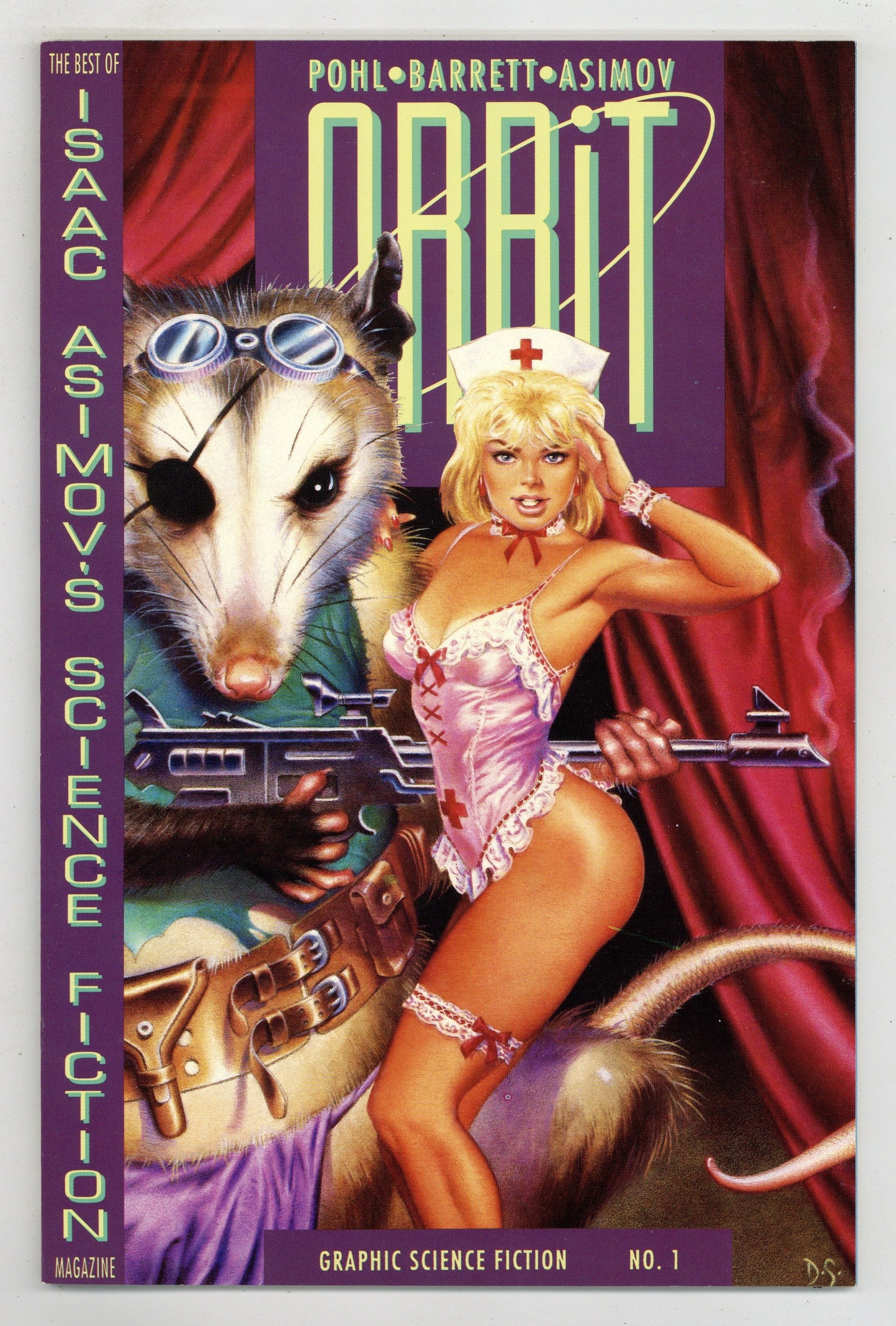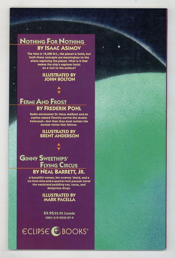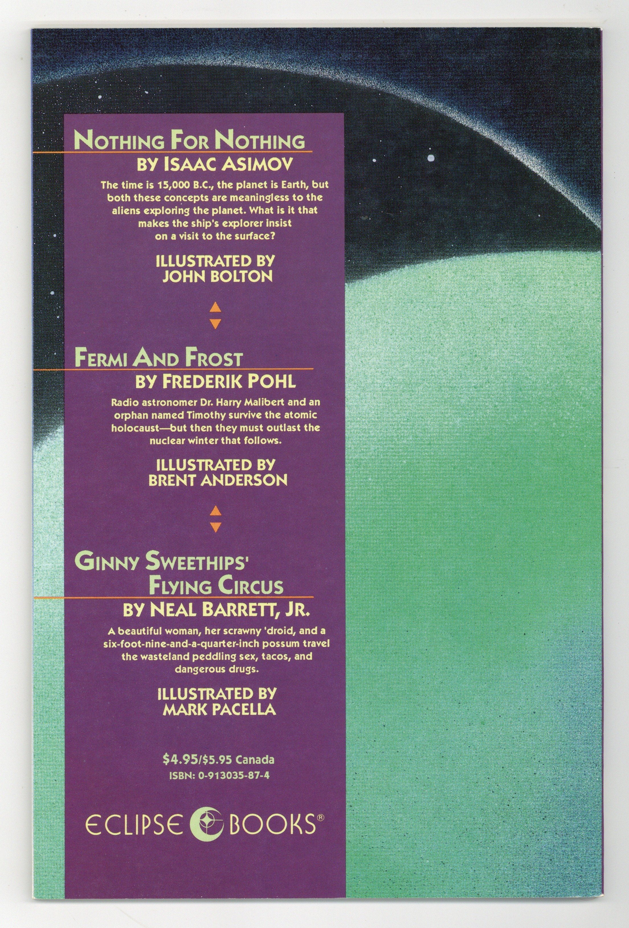 Painted cover by Dave Stevens. "Nothing For Nothing," script by Isaac Asimov (original story) and Fred Burke (adaptation), art by John Bolton; Aliens try to trade with Cro-Magnon humans. "GINNY SWEETHIPS' FLYING CIRCUS," script by Neal Barrett, Jr. (original story), Leslie Clague (adaptation), and Steve Niles (adaptation), art by Mark Pacella; A woman, an accountant droid, and an anthropomorphic opossum try to survive the collapse of civilization by selling sex, tacos, and dangerous drugs. "Fermi and Frost," script by Frederik Pohl (original story) and Brent Eric Anderson (adaptation), art by Brent Eric Anderson; Refugees from World War III try to survive a nuclear winter in Iceland. Back cover illustration by John Bolton. 52 pgs., full color. $4.95. Cover price $4.95.