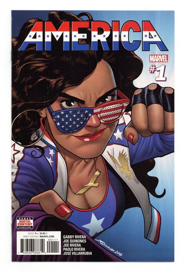 Written by Gabby Rivera. Art and Cover by Joe Quinones. At last! Everyone's favorite no-nonsense powerhouse, America Chavez, gets her own series! Written by critically-acclaimed YA novelist Gabby Rivera (Juliet Takes A Breath) and drawn by all-star artist Joe Quinones (HOWARD THE DUCK), Marvel Comics' brand new AMERICA series shines a solo spotlight on the high-octane and hard-hitting adventures of the one and only America Chavez! America has always been uncontestably awesome, and as the newly appointed leader of the Ultimates, she's now officially claimed her place as the preeminent butt-kicker of the Marvel Universe! But while leading a team of heroes and punching out big bads is great and all, it doesn't really leave much time for self-discovery… So what's a super-powered teenager do when she's looking for a little fulfillment? She goes to college! She just has to stop an interdimensional monster or two first, plus shut down a pesky alien cult that's begun worshipping her exploits! 28 pages, full color. Rated T+ Cover price $3.99.
