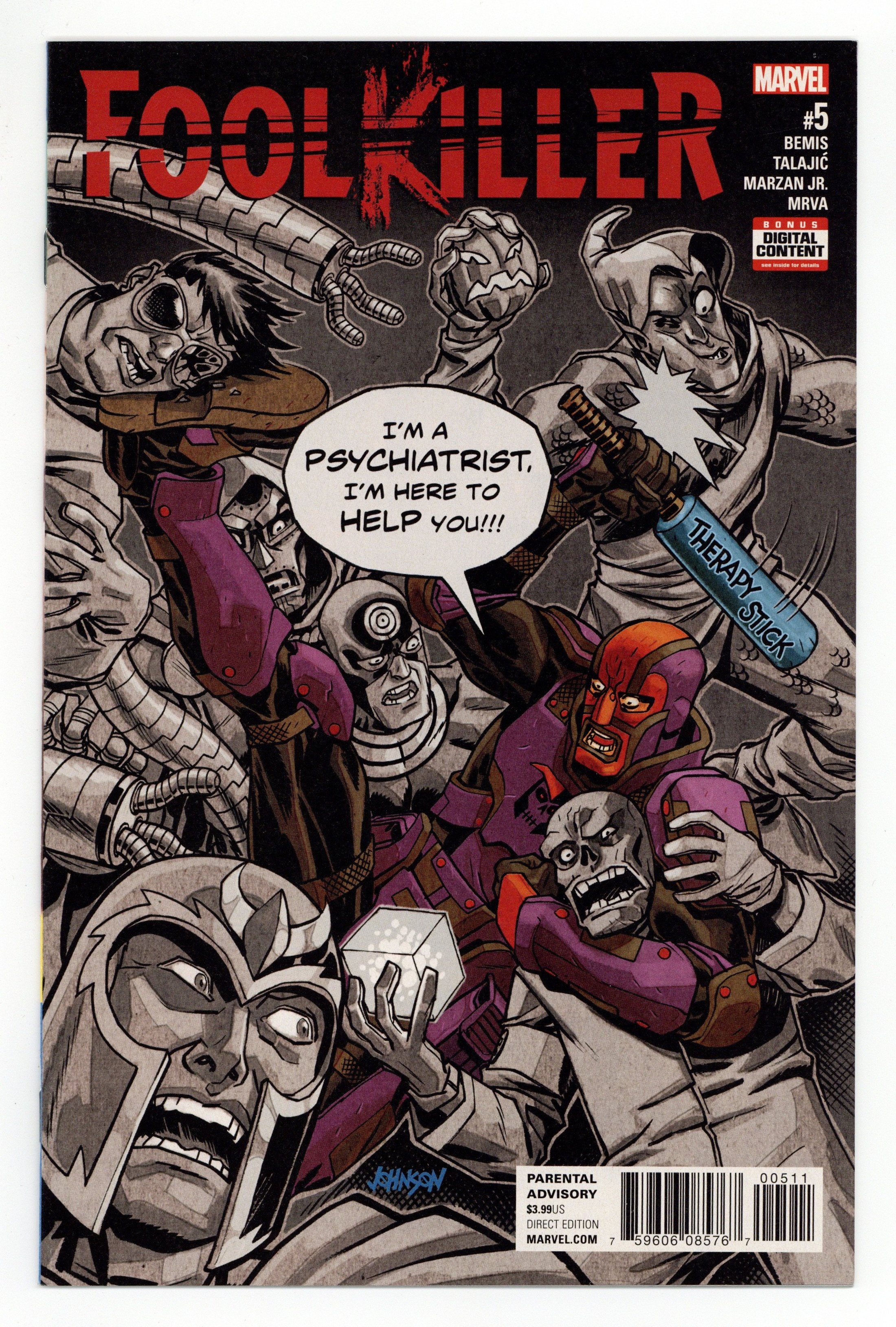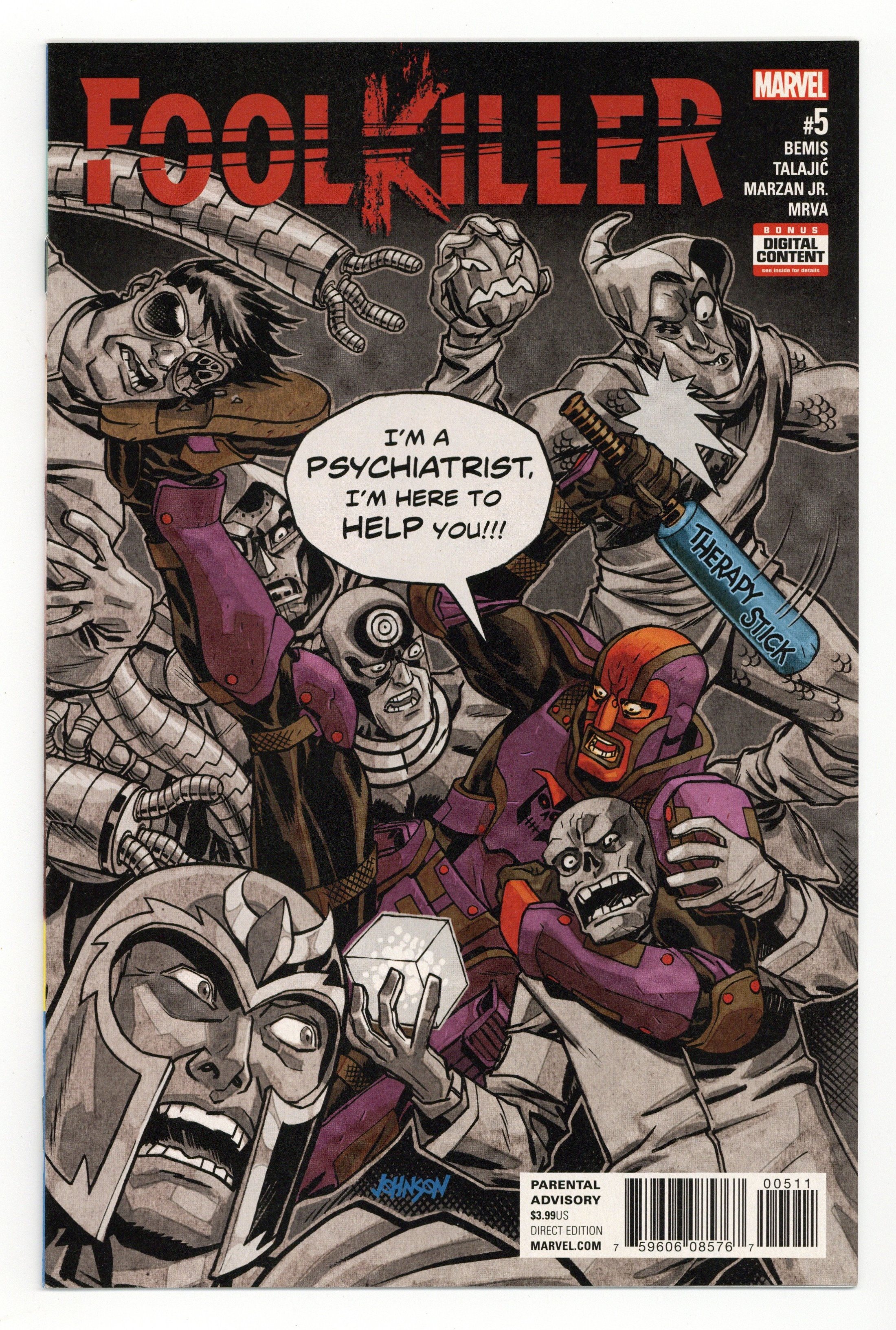 Written by Max Bemis. Art by Dalibor Talajic. Cover by Dave Johnson. Foolkiller vs. Foolkiller! What will Greg Salinger's final fate be? 28 pages, full color. Parental Advisory Cover price $3.99.