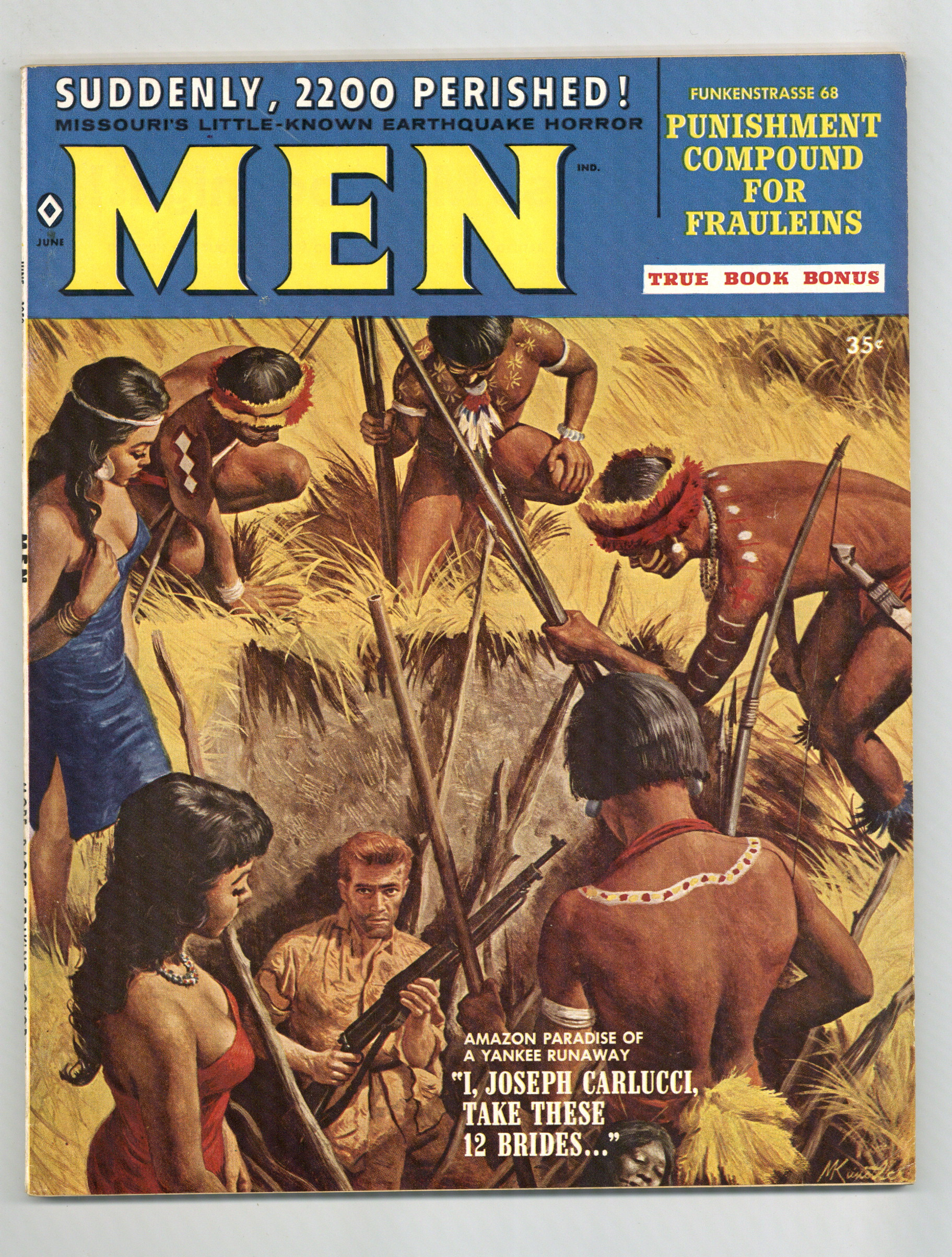 Published Jun 1959 by Zenith Publishing.$75.00Vol. 8 #6 - June 1959. Cover by Mort Kunstler. Interior art by Kunstler, James Bama, Joe Little, Arthur Renshaw, Charles Copeland and Tom Ryan. Men's magazine featuring articles on hunting, fitness, politics, true crime, and buxom beauties. 8 1/2-in. x 11-in., 100 pages, B&W. MATURE. Cover price $0.35.