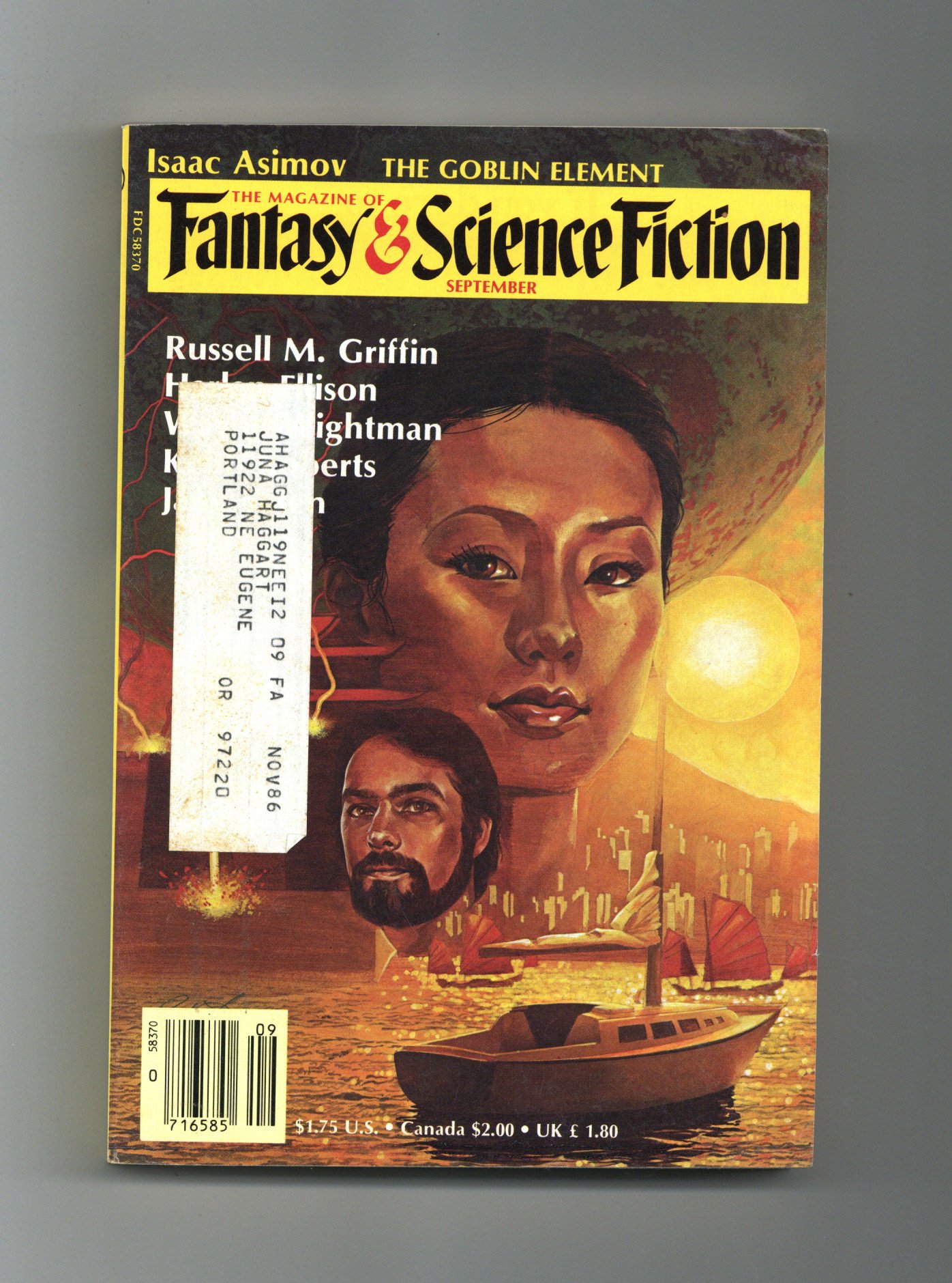 Published Sep 1985 by Mercury Publications.$2.65Volume 69, Issue 3 - September 1985. Cover by Pamela Lee. Fantasy and Science Fiction stories by Stephen Gallagher, Jane Yolen, Keith Roberts, Russell M. Griffin, Wayne Wightman, W. S. Doxey, Richard Mueller, Haskell Barkin. Science article by Isaac Asimov. Softcover. 5-in. x 7-in., 162 pages, text. Cover price $1.75.