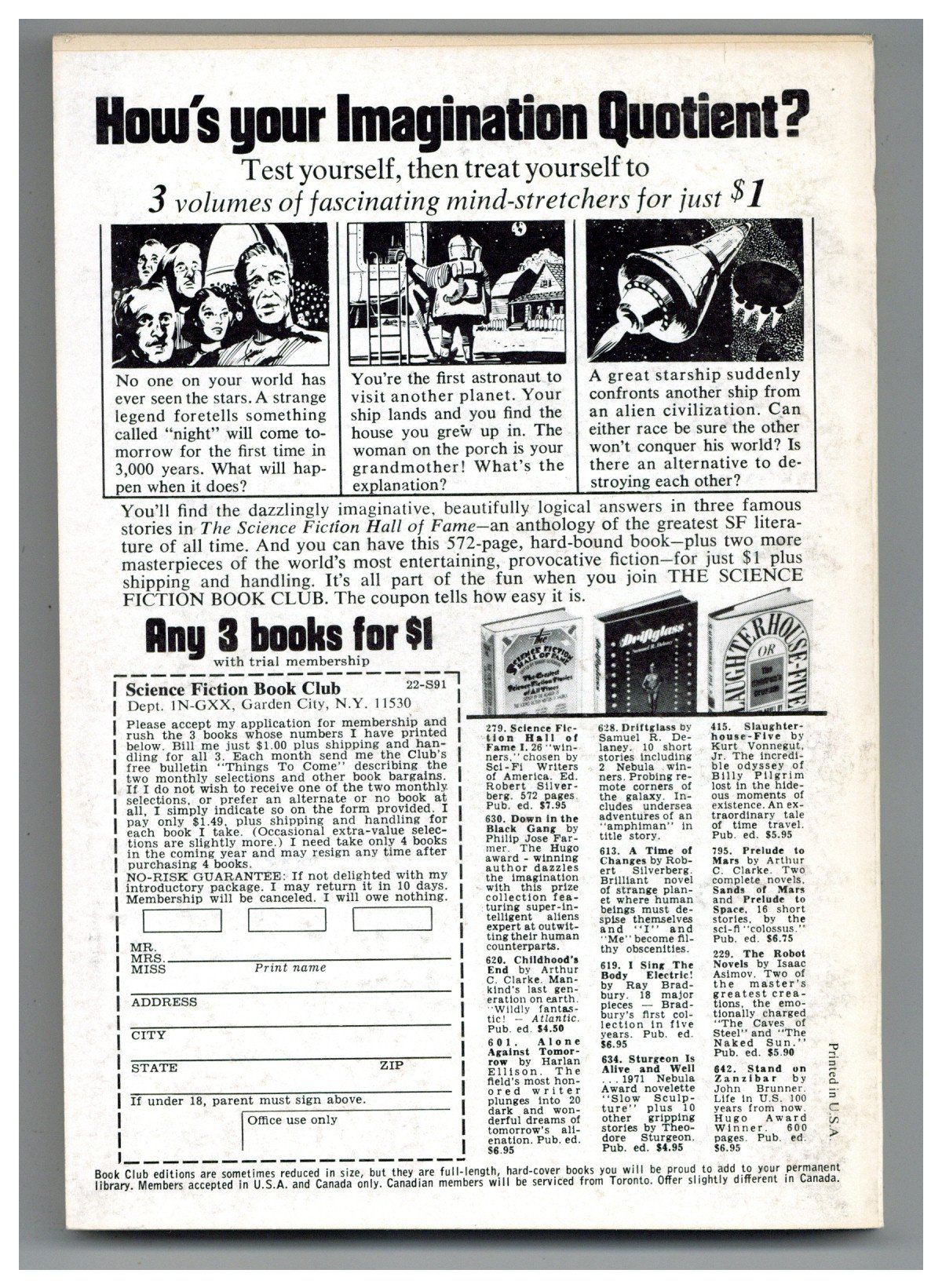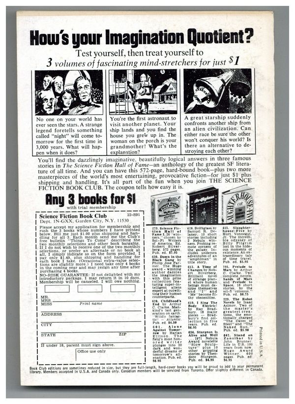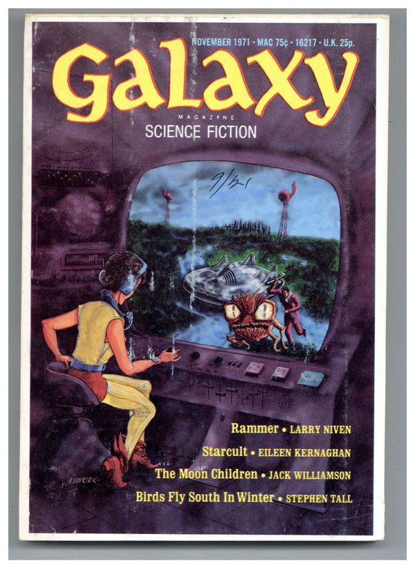 Published Nov 1971 by Galaxy Publications.$3.20November 1971. Cover by Claude Newkirk. Science fiction stories by Stephen Tall, Larry Niven, Eileen Kernaghan, Jack Williamson, A. Lentini, John Taylor, R. A. Lafferty. Illustrations by Gaughan, Newkirk. 5-1/4-in. x 7-1/4-in.; b&w text with spot illustrations; 192 newsprint pages. Cover price $0.75.