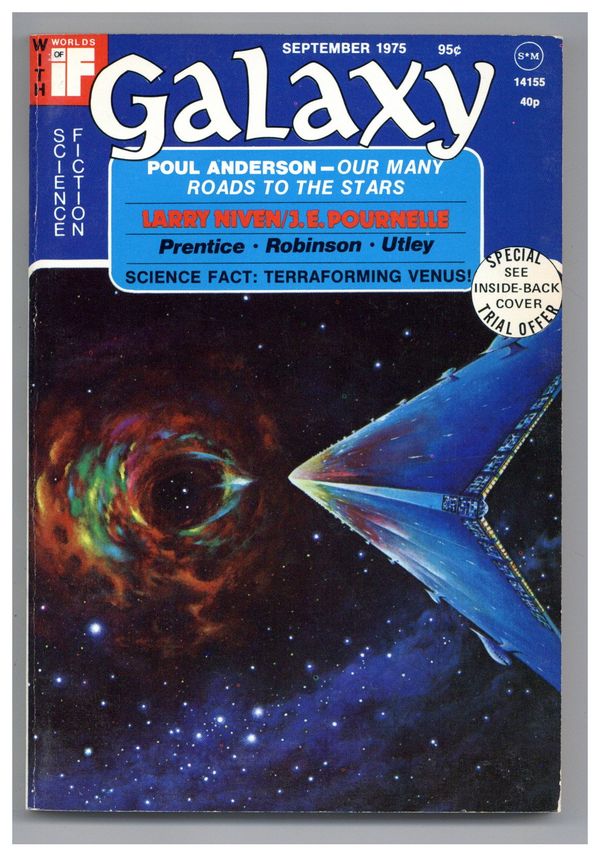Published Sep 1975 by Galaxy Publications.$10.00September 1975. Cover by Stephen Fabian. Science fiction stories by Jeffrey Carver, Patrick Henry Prentice, Christopher Irwin, Gail Kimberly, Spider Robinson, Stephen Utley, Larry Niven, J. E. Pournelle. Illustrations by Ames, Fabian, Freff, Pini. 5-1/8 in. x 7-5/8 in.; black and white; 160 newsprint pages. Cover price $0.95.
