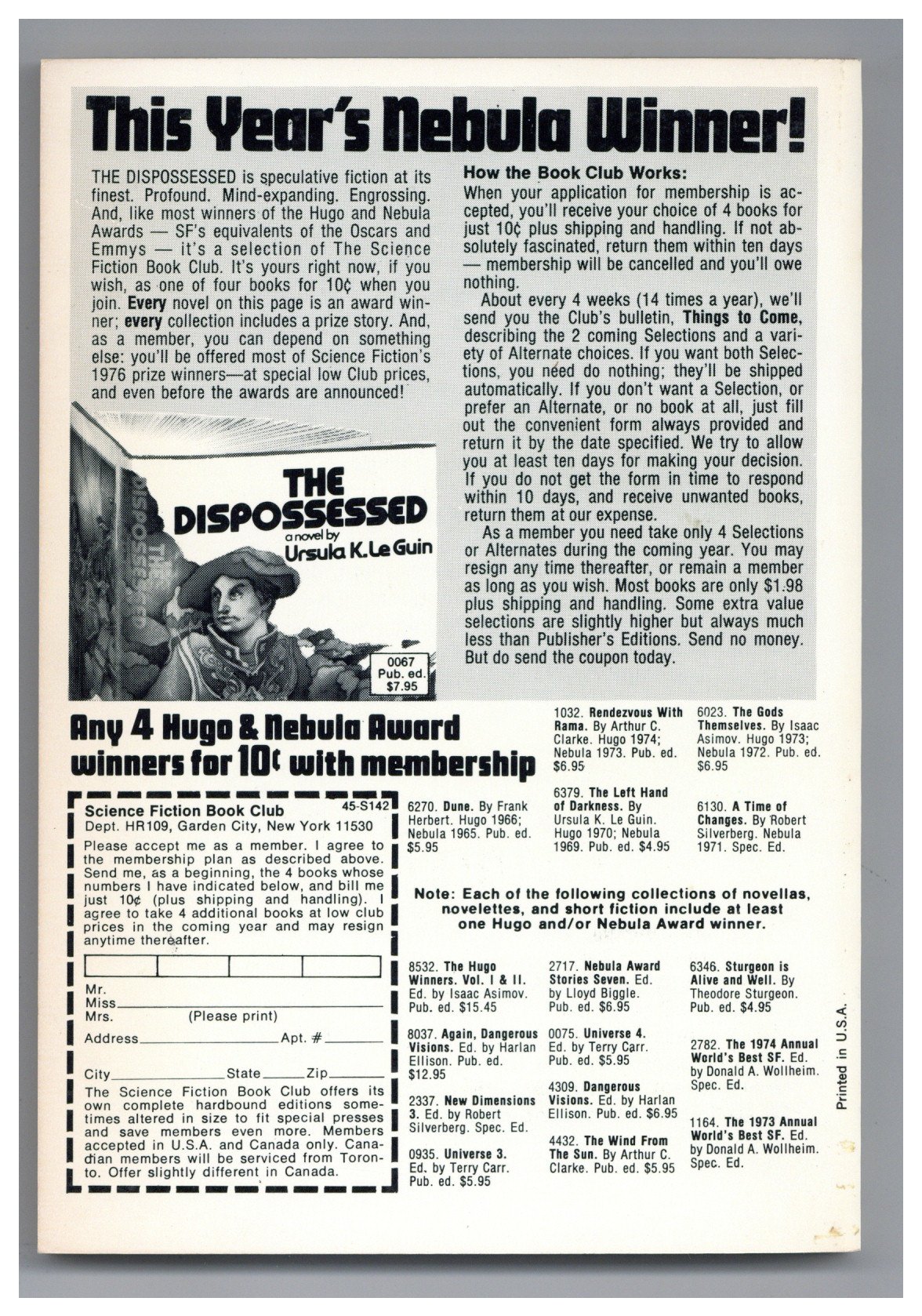 September 1975. Cover by Stephen Fabian. Science fiction stories by Jeffrey Carver, Patrick Henry Prentice, Christopher Irwin, Gail Kimberly, Spider Robinson, Stephen Utley, Larry Niven, J. E. Pournelle. Illustrations by Ames, Fabian, Freff, Pini. 5-1/8 in. x 7-5/8 in.; black and white; 160 newsprint pages. Cover price $0.95.