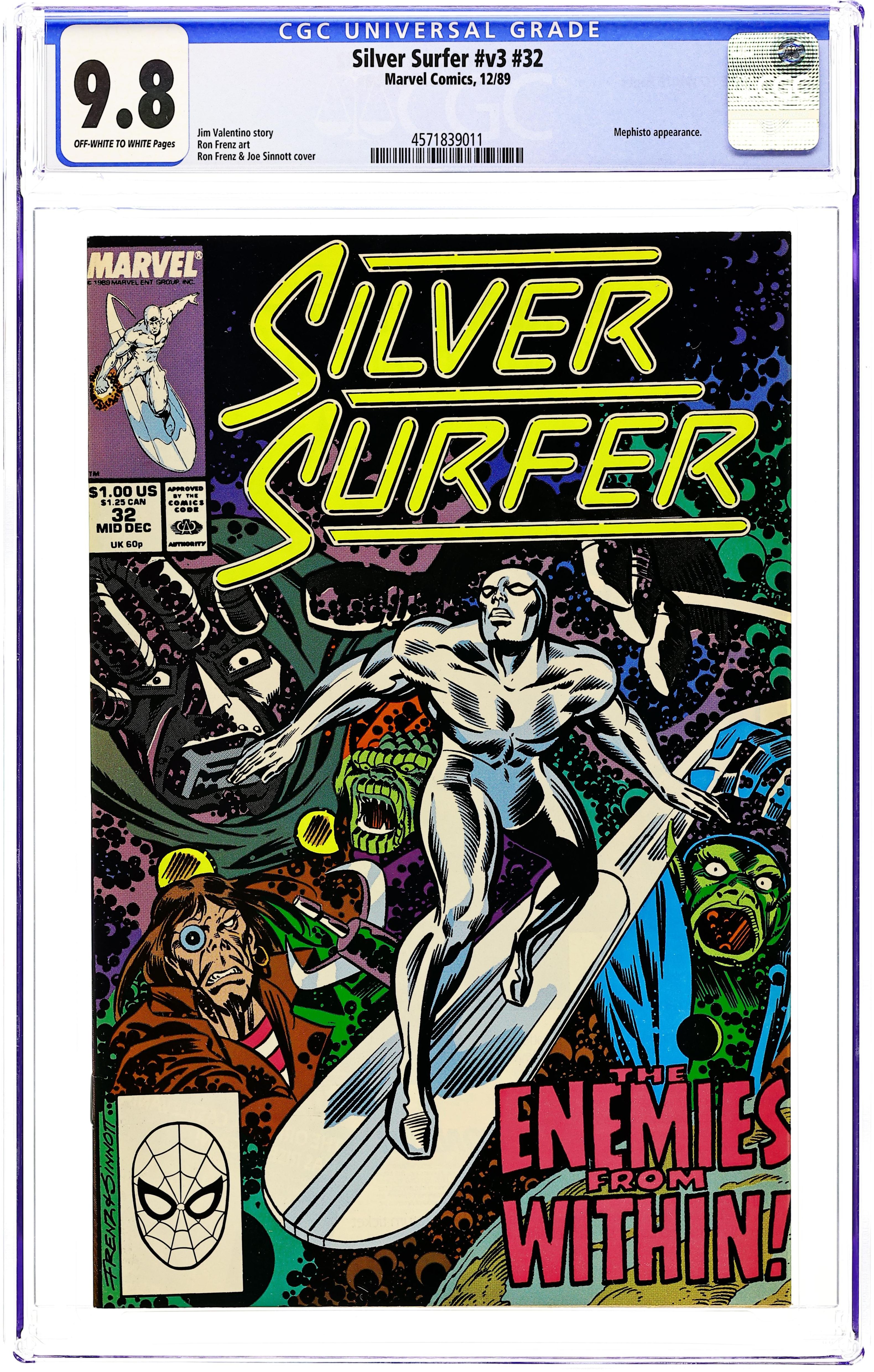 1st printing. "A Choice of Dooms!" Story by Jim Valentino. Art by Ron Frenz and Joe Sinnott. With the Kree/Skrull War behind him the Silver Surfer is once again free to soar the endless spaceways. But the good times can't last forever as an enemy from the past ceases this opportunity to attack. An enemy considered by many to be the embodiment of evil in the Marvel Universe. Cover price $1.00.