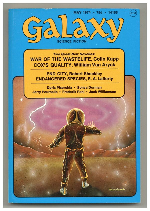 Published May 1974 by Galaxy Publications.$18.00Cover by Rick Sternbach. Science fiction stories by William Van Aryck, Colin Kapp, Robert Sheckley, Robert F. Young, Larry Eisenberg, Doris Piserchia, Sonya Dorman, Frederik Pohl, Jack Williamson. Illustrations by Guaghan. 5-1/4-in. x 7-1/4-in.; b&w text with spot illustrations; 176 newsprint pages. Cover price $0.75.