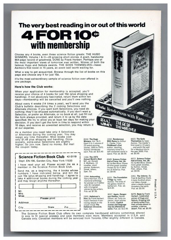 Cover by Rick Sternbach. Science fiction stories by William Van Aryck, Colin Kapp, Robert Sheckley, Robert F. Young, Larry Eisenberg, Doris Piserchia, Sonya Dorman, Frederik Pohl, Jack Williamson. Illustrations by Guaghan. 5-1/4-in. x 7-1/4-in.; b&w text with spot illustrations; 176 newsprint pages. Cover price $0.75.