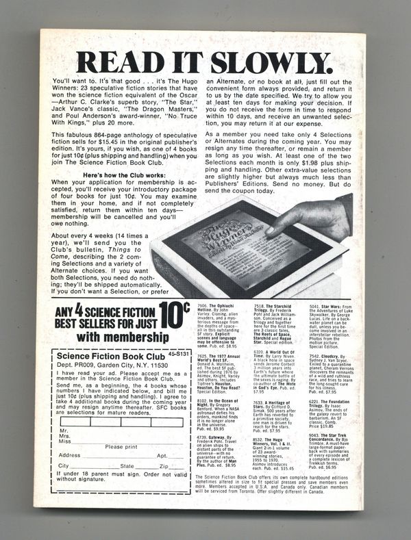 December 1977-January 1978. Cover by Joan Woods. Science Fiction Stories by William Walling, Roger Zelazny, Timothy P. Lewis, Tim Joseph, Lee Whipple, Jesse Peel. Interior Illustrations by Anji Valenza, Jim Mueller, Amy Harlib, Joan Hanke-Woods. Softcover Pulp Digest, 5-in x 7 1/2-in, 160 Pages, B&W. Cover price $1.25.
