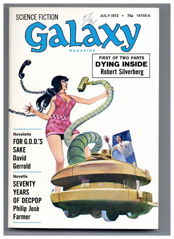 Published Jul 1972 by Galaxy Publications.$4.60July-August 1972. Cover by Jack Gaughan. Science fiction stories by Philip Jose Farmer, David Gerrold, Robert Silverberg, Sandy Fisher, Thomas N. Scortia. Illustrations by Gaughan. 5-1/4-in. x 7-1/4-in.; b&w text with spot illustrations; 176 newsprint pages. Cover price $0.75.