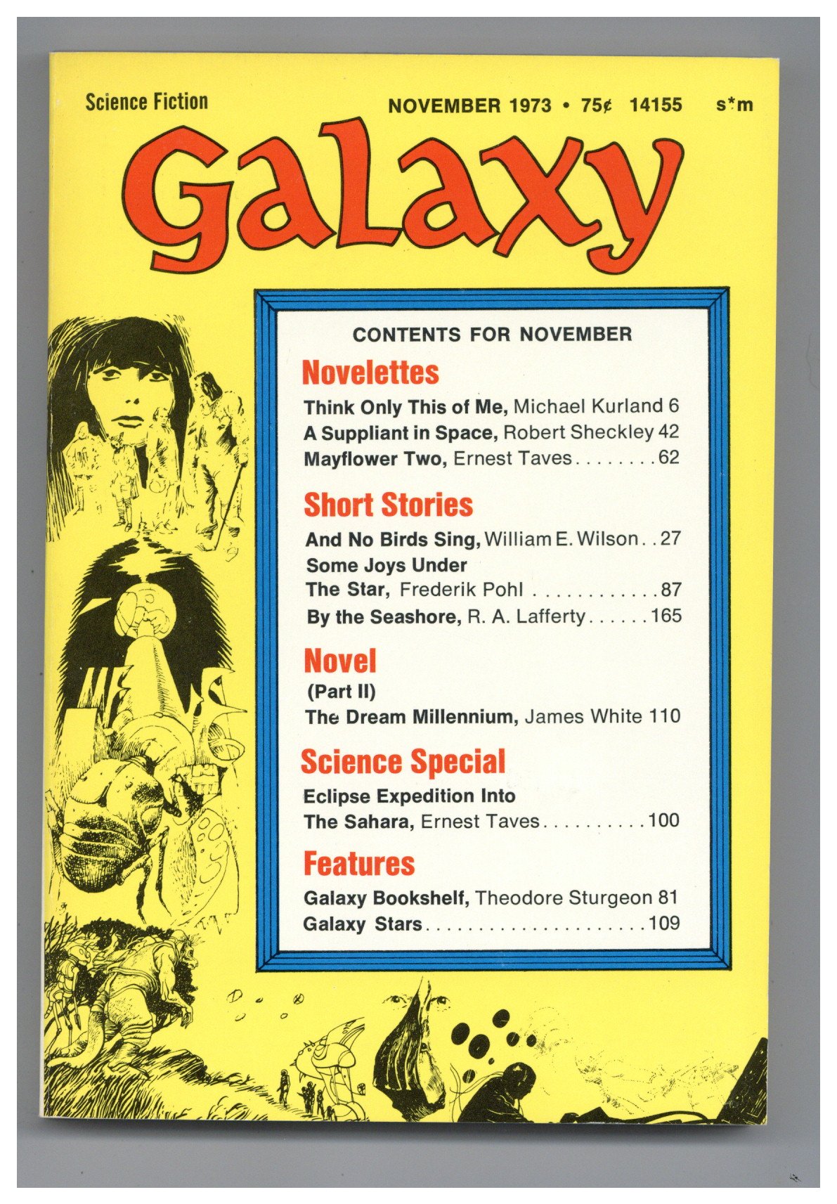Published Nov 1973 by Galaxy Publications.$30.00Test Market Variant Cover. Looking to cut costs, the publishers test marketed a variant cover with a montage of drawings taken from the interior (by Jack Gaughan) in place of the normal painted cover. Science fiction stories by Michael Kurland, Robert Sheckley, Ernest Taves, William E. Wilson, Frederik Pohl, R. A. Lafferty, James White. Illustrations by Gaughan. 5-1/4-in. x 7-1/4-in.; b&w text with spot illustrations; 176 newsprint pages. Cover price $0.75.