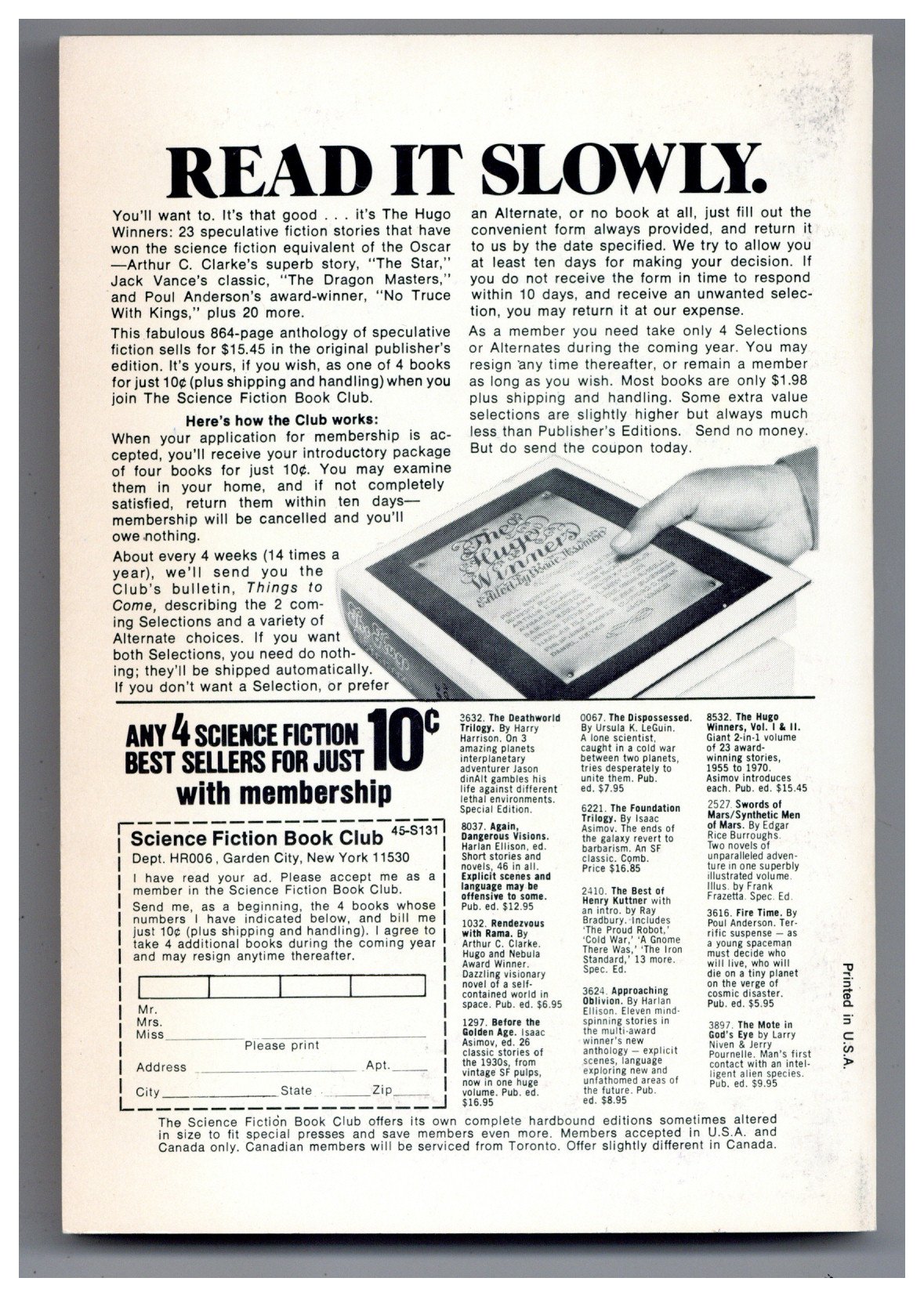Cover by Rick Sternbach. Science fiction stories by Jerry Pournelle, Jon DeCles, Robert Sheckley, William Chait, Sam Nicholson, Arsen Darnay. Illustrations by Jack Gaughan, Rich Sternbach, Stephen Fabian, Freff. 5-1/8 in. x 7-5/8 in.; black and white; 160 newsprint pages. Cover price $1.00.
