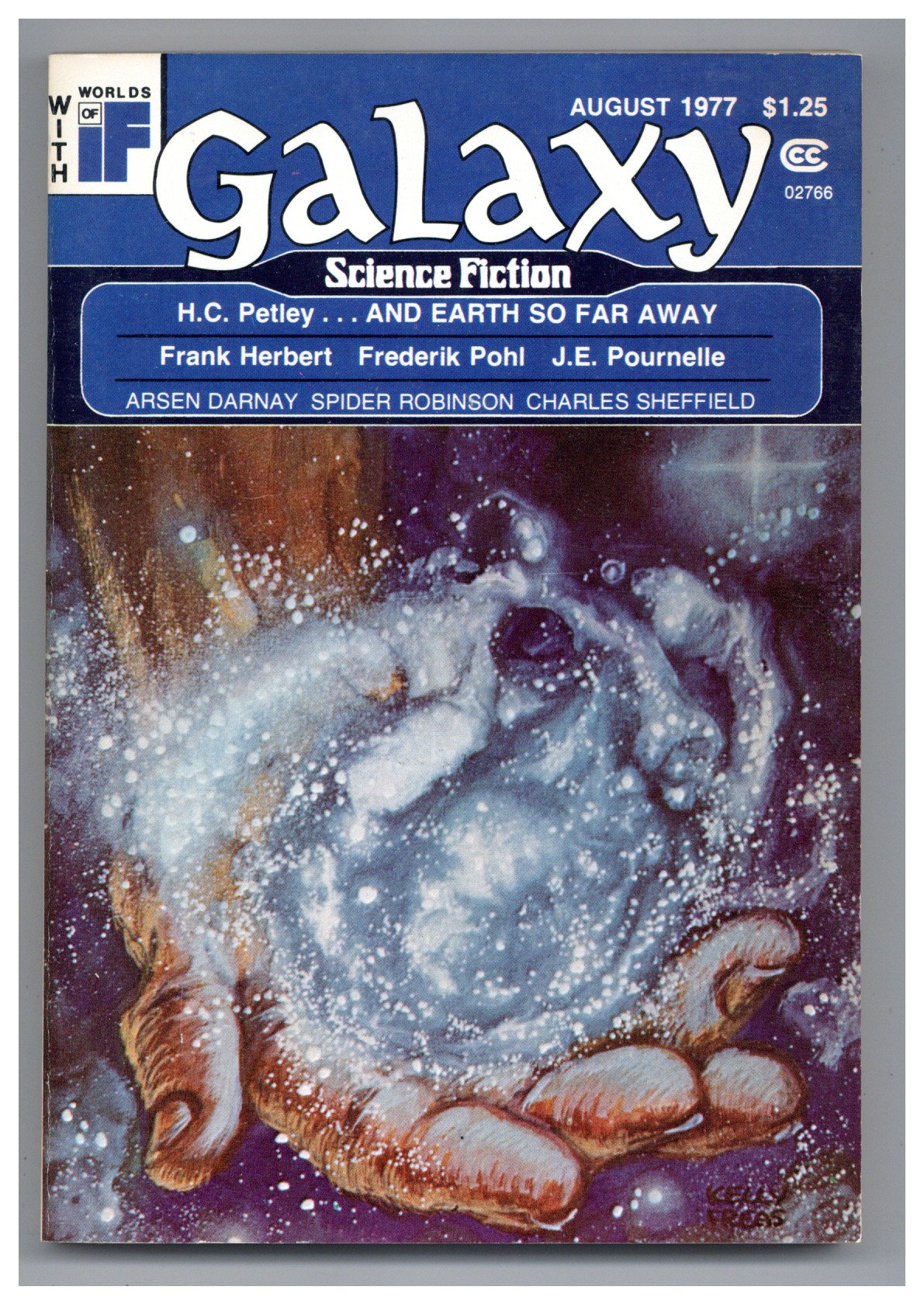 Published Aug 1977 by Galaxy Publications.$12.00Cover by Kelly Freas. Science fiction stories by H. C. Petley, Arsen Darnay, Charles Sheffield, Jay Brandon, Frank Herbert. Illustrations by James Odbert, Stephen Fabian, P. Suedo. Softcover Pulp Digest, 5-in x 7 1/2-in, 160 Pages, B&W. Cover price $1.25.