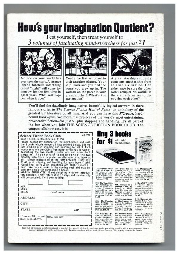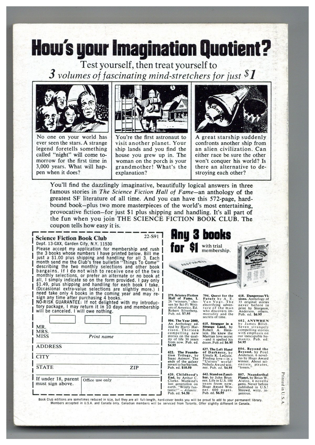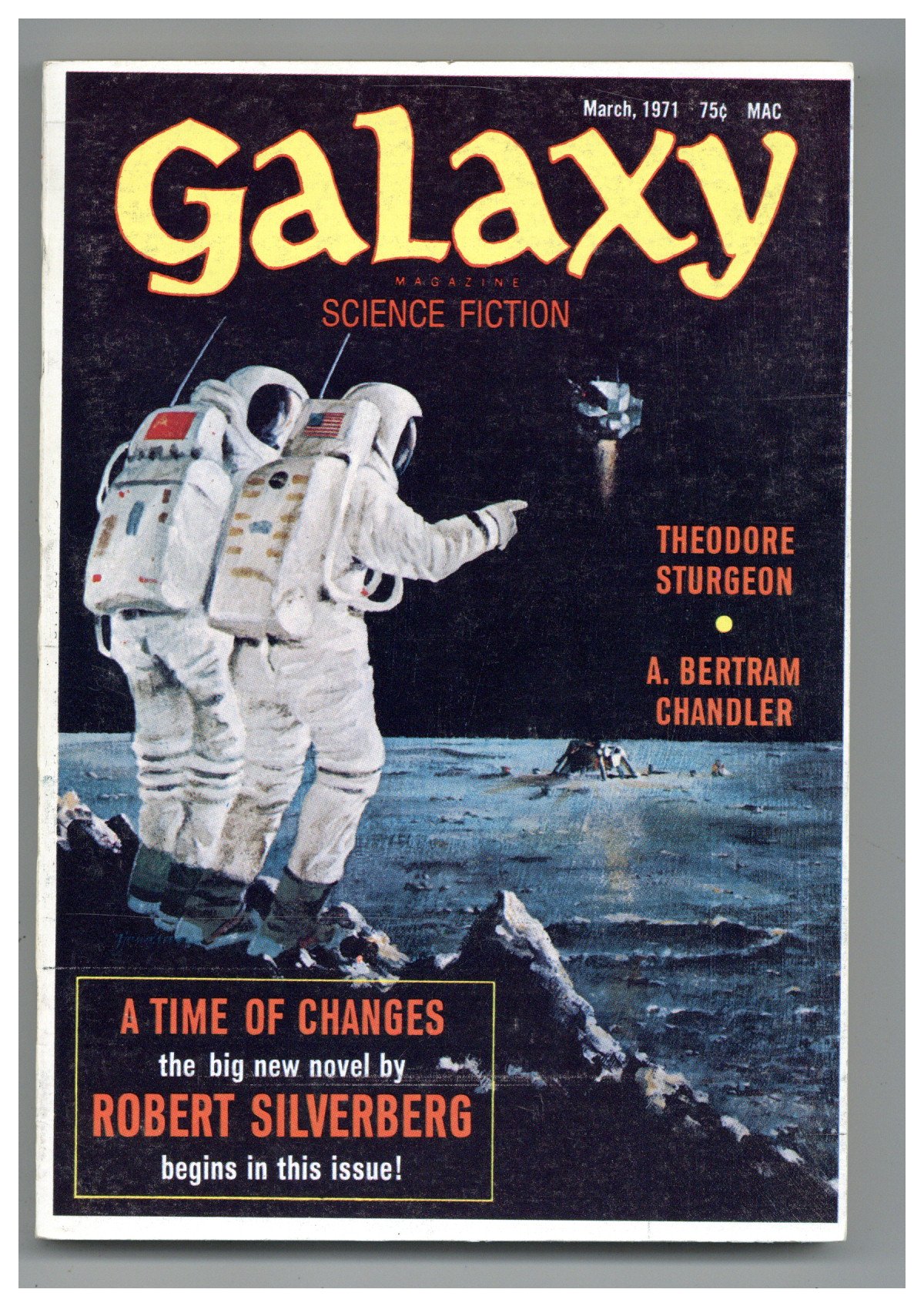 Published Mar 1971 by Galaxy Publications.$8.00Cover by Jack Gaughan. Science fiction stories by A. Bertram Chandler, Greg Benford, James Tiptree Jr, Robert Silverberg, Ernest Taves, J. R. Pierce, Chelsea Quinn Yarbro, Duncan Lunan, Barry Malzberg. Illustrations by Gaughan. 5-1/4-in. x 7-1/4-in.; b&w text with spot illustrations; 192 newsprint pages. Cover price $0.75.