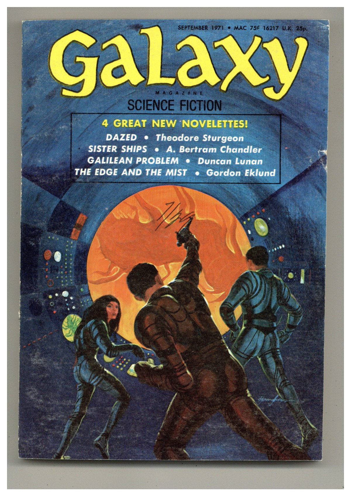 Published Sep 1971 by Galaxy Publications.$3.60September-October 1971. Cover by Jack Gaughan. Science fiction stories by Gordon Eklund, Theodore Sturgeon, A. Bertram Chandler, Duncan Lunan, Jack Williamson, Alan Dean Foster. Illustrations by Gaughan. 5-1/4-in. x 7-1/4-in.; b&w text with spot illustrations; 176 newsprint pages. Cover price $0.75.