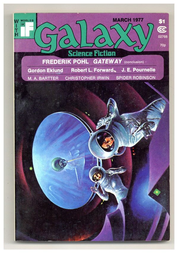 Published Mar 1977 by Galaxy Publications.$12.00Cover by Stephen Fabian. Science fiction stories by Christopher Irwin, M. A. Bartter, Gordon Eklund, Spider Robinson, Frederik Pohl. Interior Illustrations by Rich Sternbach, Jack Gaughan, Vincent Di Fate, Stephen Fabian. Softcover Pulp Digest, 5-in x 7 1/2-in, 160 Pages, B&W. Cover price $1.00.