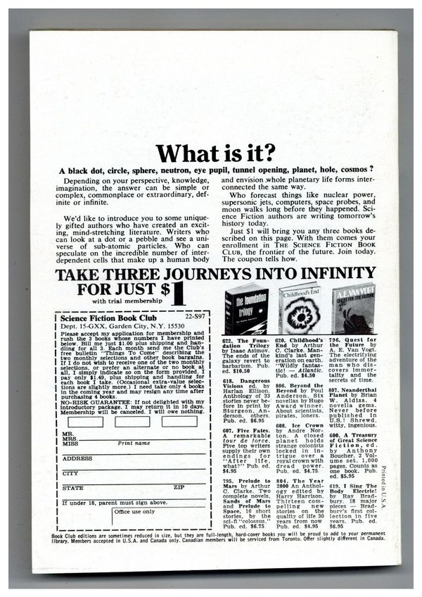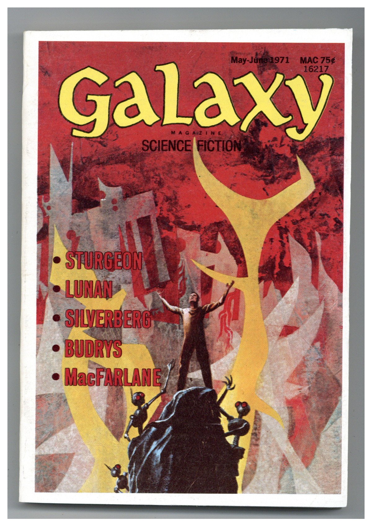 Published May 1971 by Galaxy Publications.$10.00May-June 1971. Cover by Jack Gaughan. Science fiction stories by Ernest Hill, James Gunn, Robert Silverberg, W. Macfarlane, Theodore Sturgeon, Duncan Lunan, Jack Sharkey, Larry Eisenberg, David Bunch. Illustrations by Gaughan. 5-1/4-in. x 7-1/4-in.; b&w text with spot illustrations; 176 newsprint pages. Cover price $0.75.