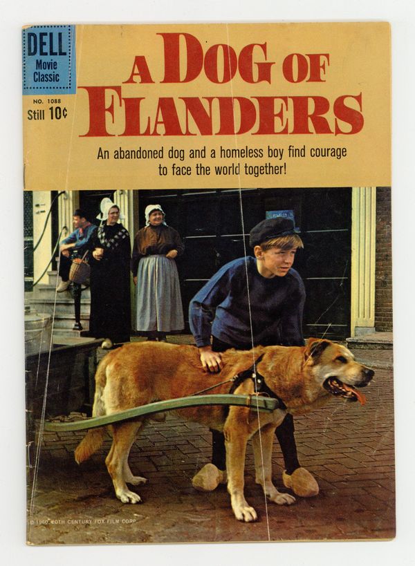 $3.20Version with The Timeless Land of Flanders on back cover. Indicia title is "A DOG OF FLANDERS, No. 1088." Adapted from the 1959 movie "A Dog of Flanders." A Dog Of Flanders, script by Eric Freiwald and Robert Schaefer, pencils by Bill Ziegler and Dan Spiegle, inks by Dan Spiegle; Young Nello Daas is an aspiring artist who lives with his elderly grandfather; The two take in a cruelly-treated dog and nurse him back to health; Nello befriends an artist, who helps him when his grandfather dies and he is left on his own. Facts about the life of Flemish master artist Peter Paul Ruebens. 36 pages, full color. Cover price $0.10.