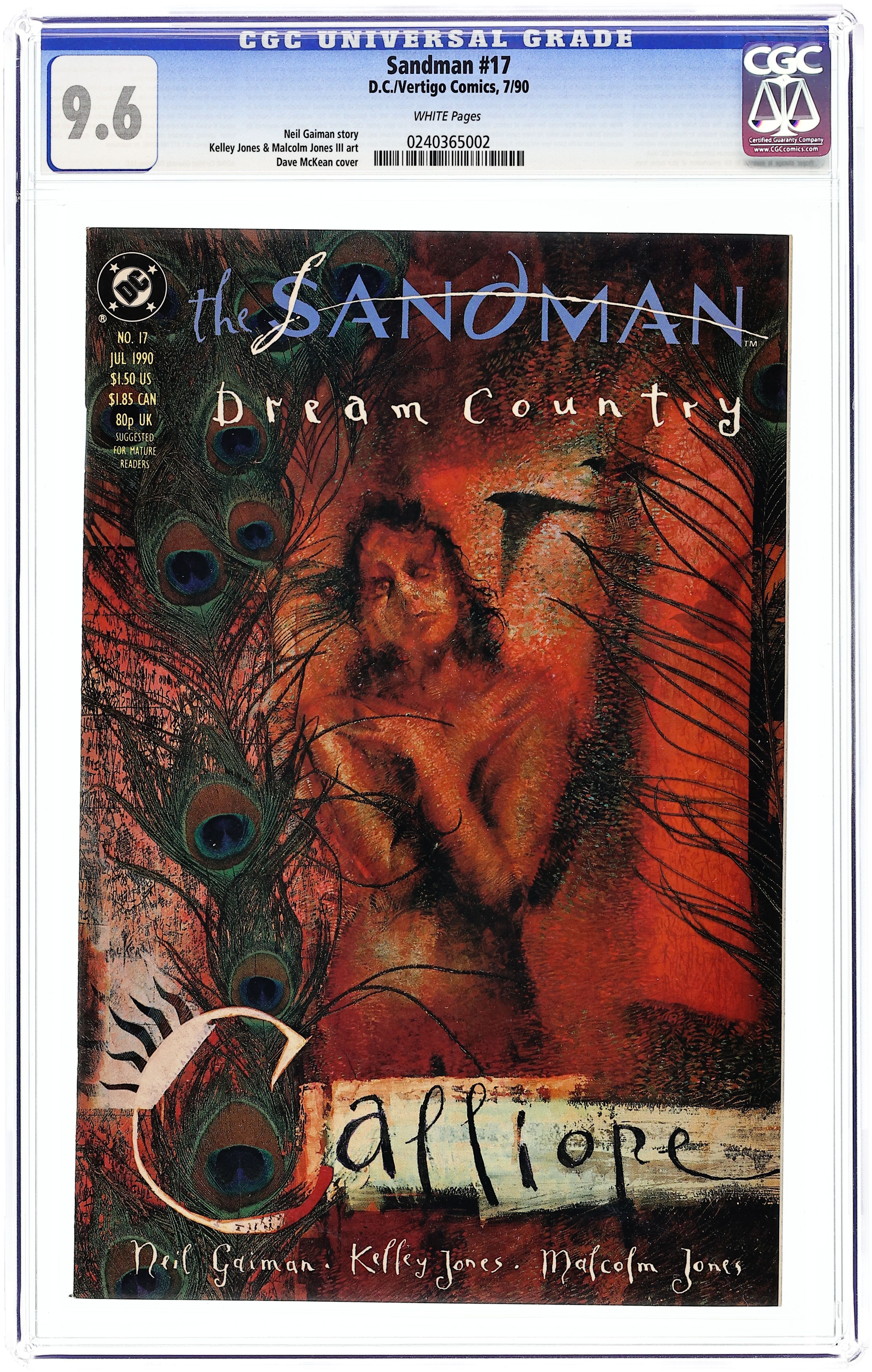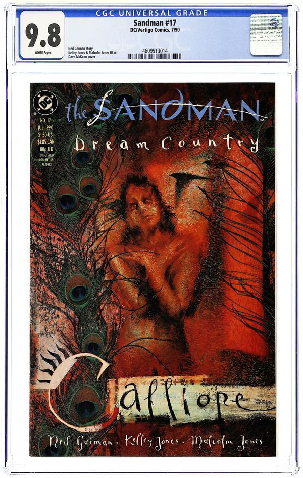 Dream Country, Part 1 of 4: "Calliope." Sandman's London house has some new residents...only they're not exactly human. Written by Neil Gaiman, with art by Kelley Jones and Malcolm Jones III. Painted cover by Dave McKean. Suggested for Mature Readers. New Format. Cover price $1.50.