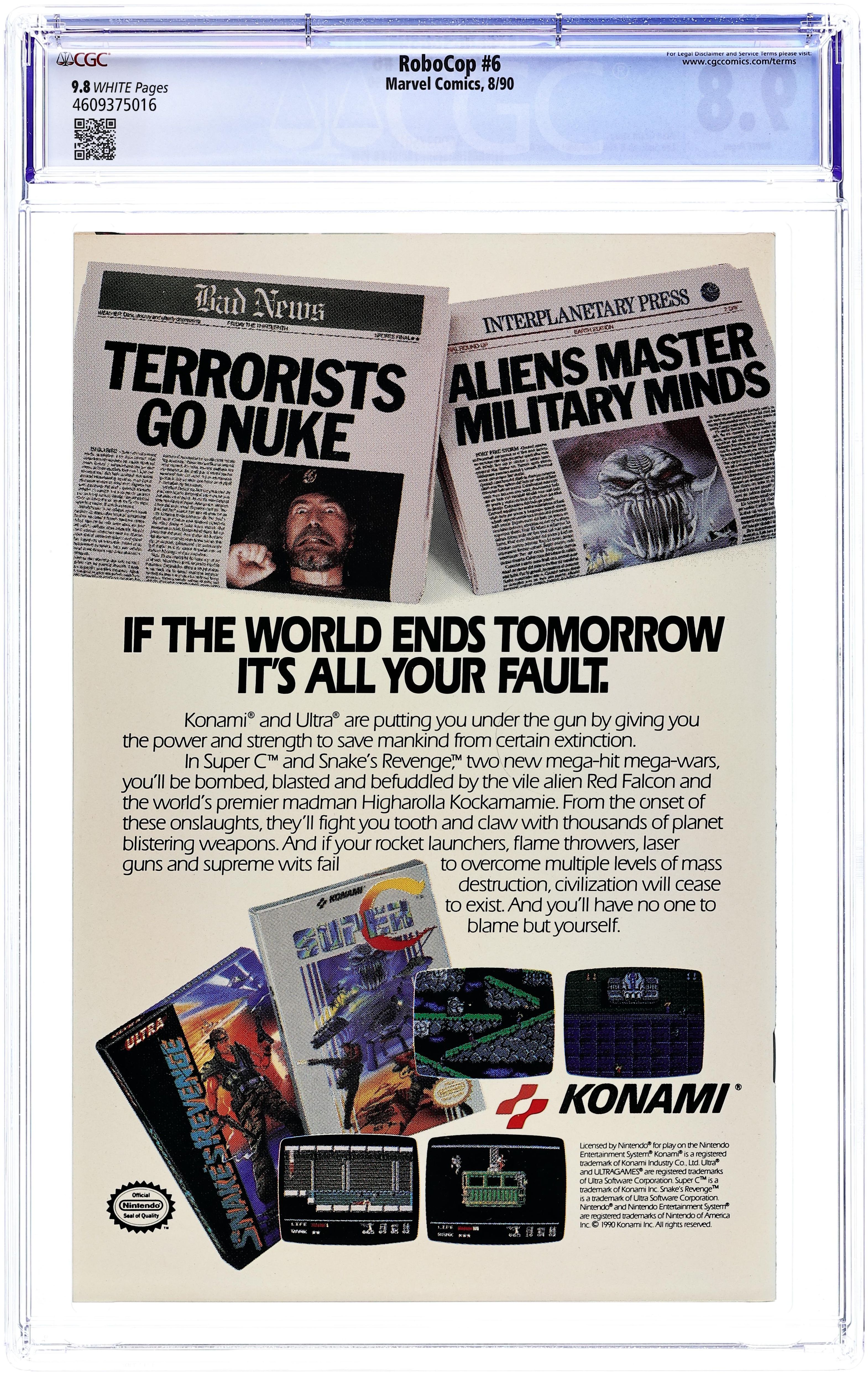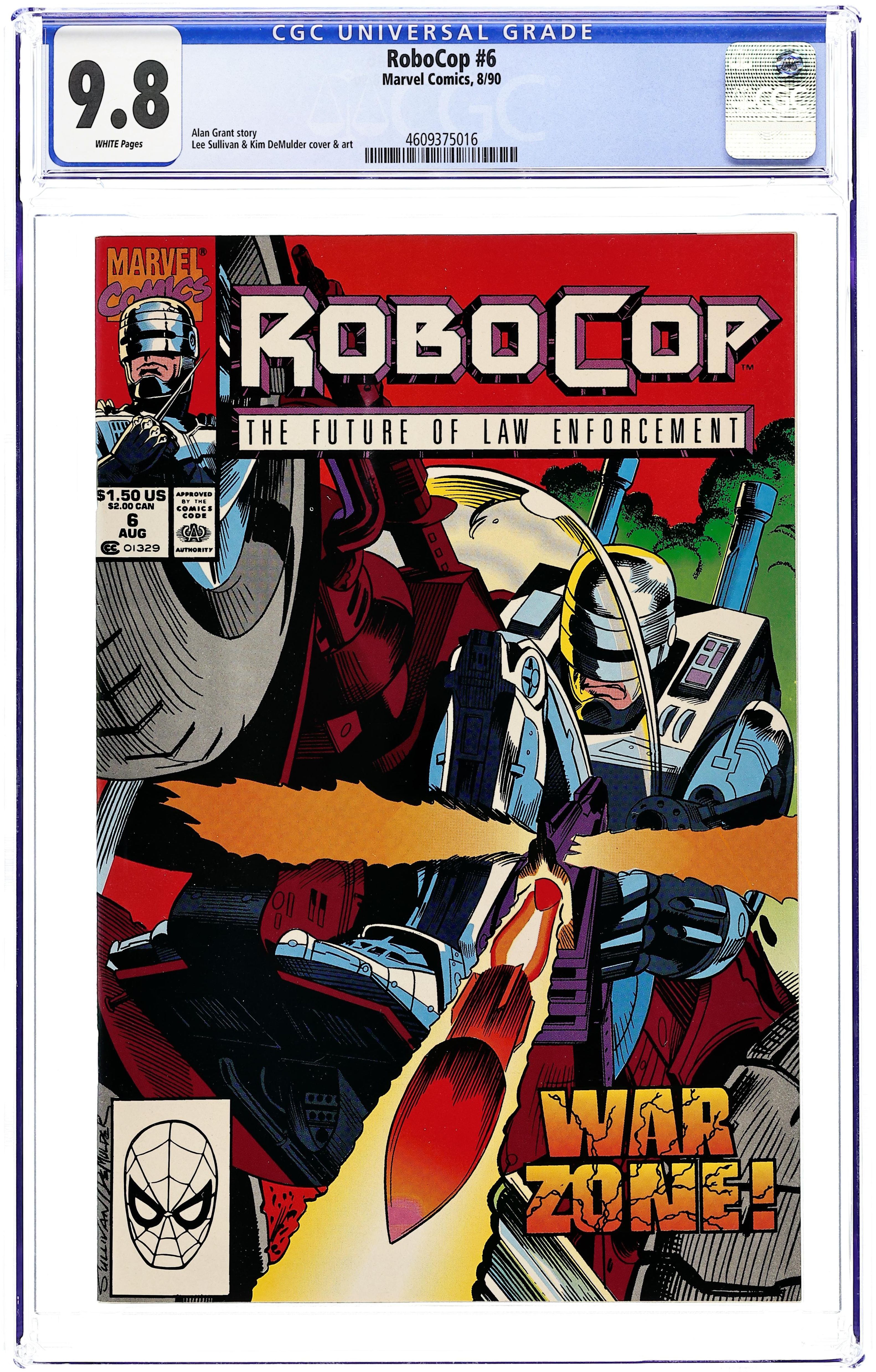 Cover by Lee Sullivan and Kim DeMulder. War Crimes!, script by Alan Grant, art by Lee Sullivan and Kim DeMulder; RoboCop reaches the Desert Hawk but is persuaded to see his side of the war as a leader trying to save his people from famine; Convinced of Desert Hawks noble intentions, RoboCop leaves to intercept an advancing Spanish military force on Desert Hawks fortress; After a brief battle with this small army and an unexpected ED-209 unit also being tested for warfare, RoboCop contacts the Old Man via Satellite Uplink; The war started because Desert Hawk was sending his people to Spain to survive the famine they were experiencing; Robocop shares how Desert Hawk had found a viable means of underground irrigation that would save his people but would take time to be fully realized. 36 pgs., full color. $1.50. Cover price $1.50.
