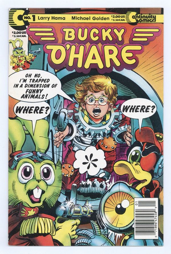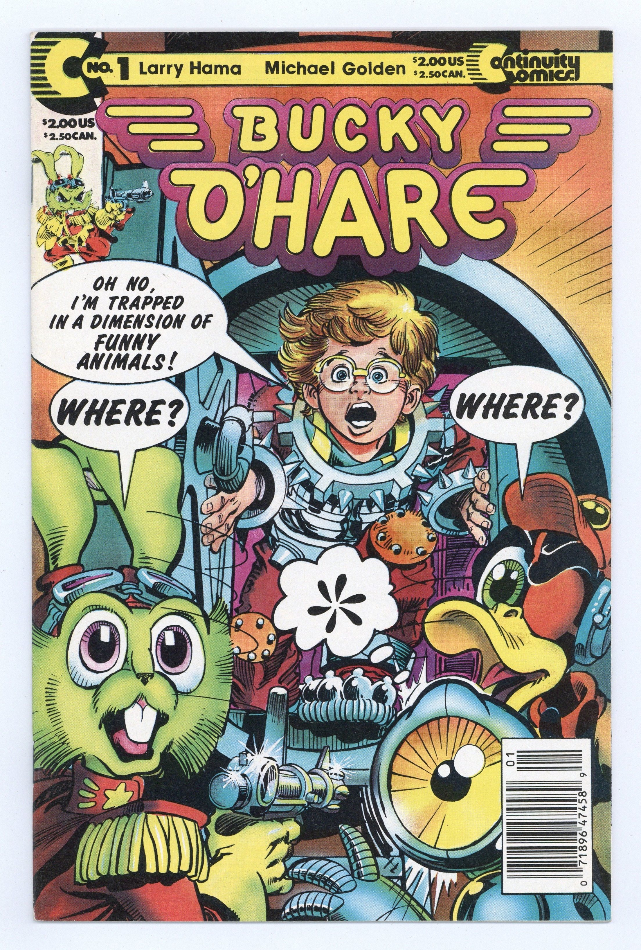 Story by Larry Hama. Art by Michael Golden. Cover by Michael Golden. Anthropomorphic action-adventure with Bucky O'Hare and the crew of the Righteous Indignation. During a battle with the Toad Menace, rabbit space pilot Bucky O'Hare accidentally opens a dimensional gateway to Earth, drawing boy genius Willy Duwitt into their spacefaring adventures. 32 pages, Full Color. Cover price $2.00.