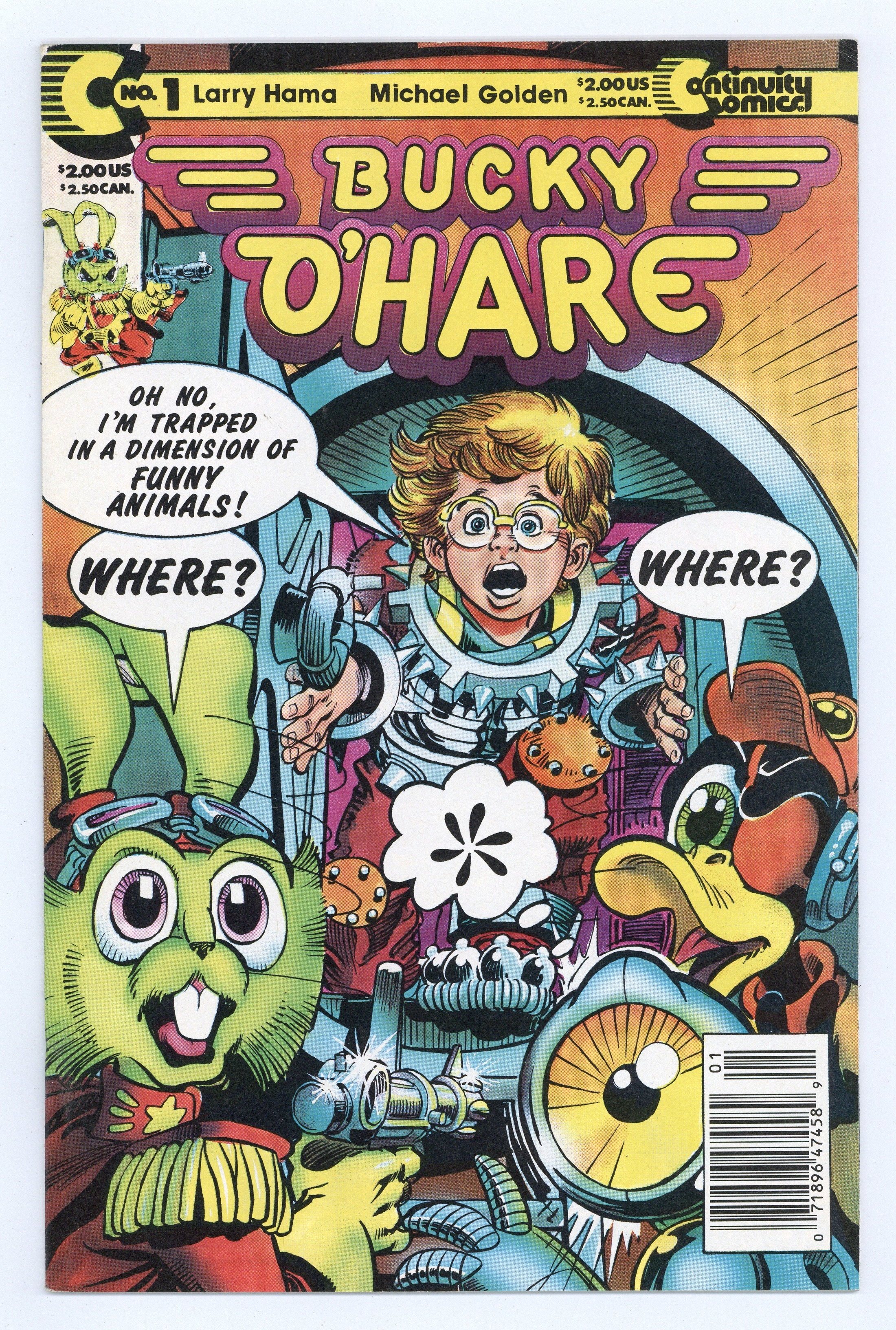 Published Jan 1991 by Continuity.$12.00Story by Larry Hama. Art by Michael Golden. Cover by Michael Golden. Anthropomorphic action-adventure with Bucky O'Hare and the crew of the Righteous Indignation. During a battle with the Toad Menace, rabbit space pilot Bucky O'Hare accidentally opens a dimensional gateway to Earth, drawing boy genius Willy Duwitt into their spacefaring adventures. 32 pages, Full Color. Cover price $2.00.