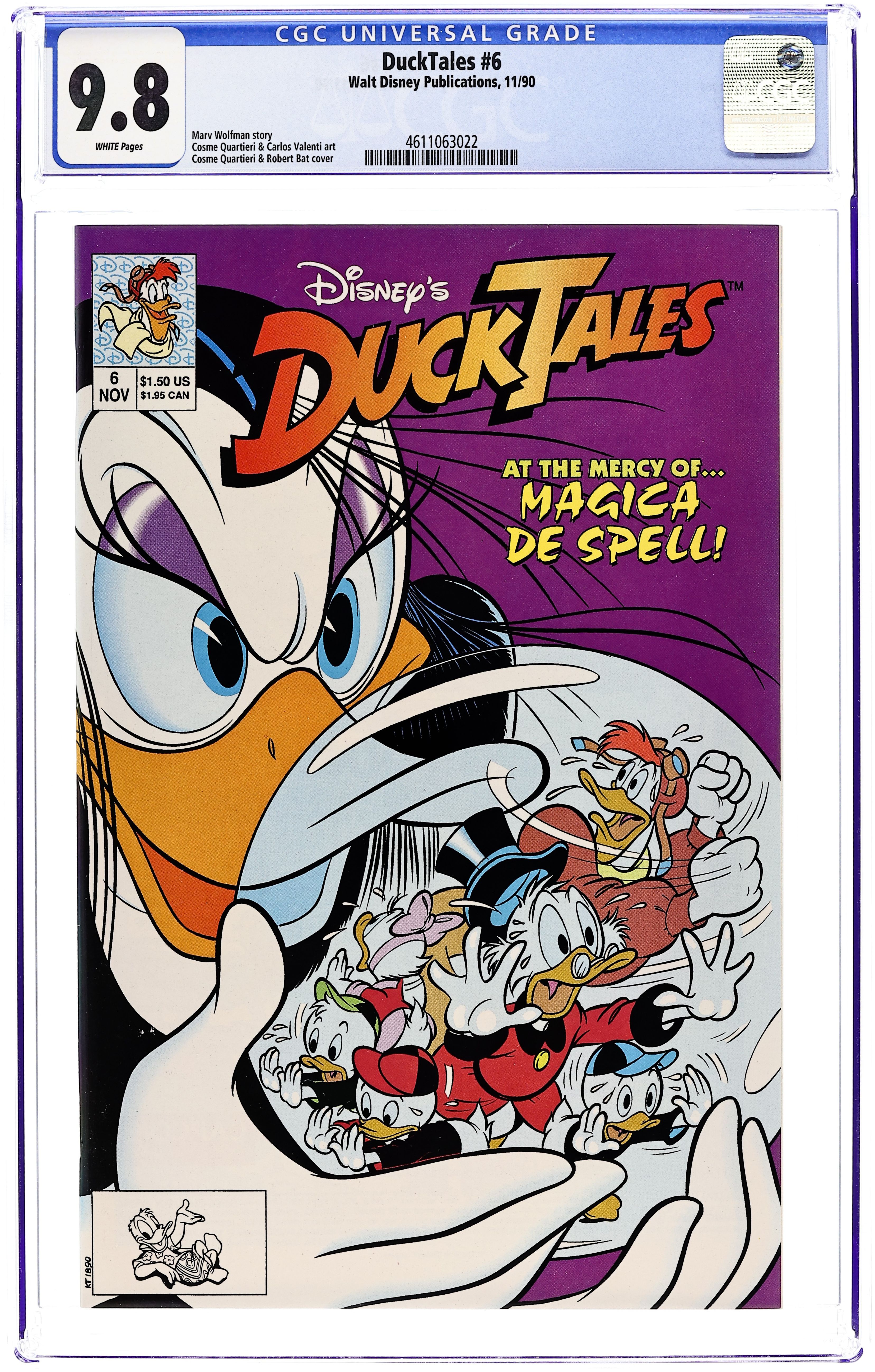Scrooge's Quest: Part 6 of 7 - "Down, But Not Out, in Duckburg!" Story by Marv Wolfman. Art by Cosme Quartieri and Robert Bat. Scrooge McDuck and his companions chase the cruel witch, Magica DeSpell half-way around the world in order to recover his prized possession - his #1 Dime. FC, 32 pages Cover price $1.50.
