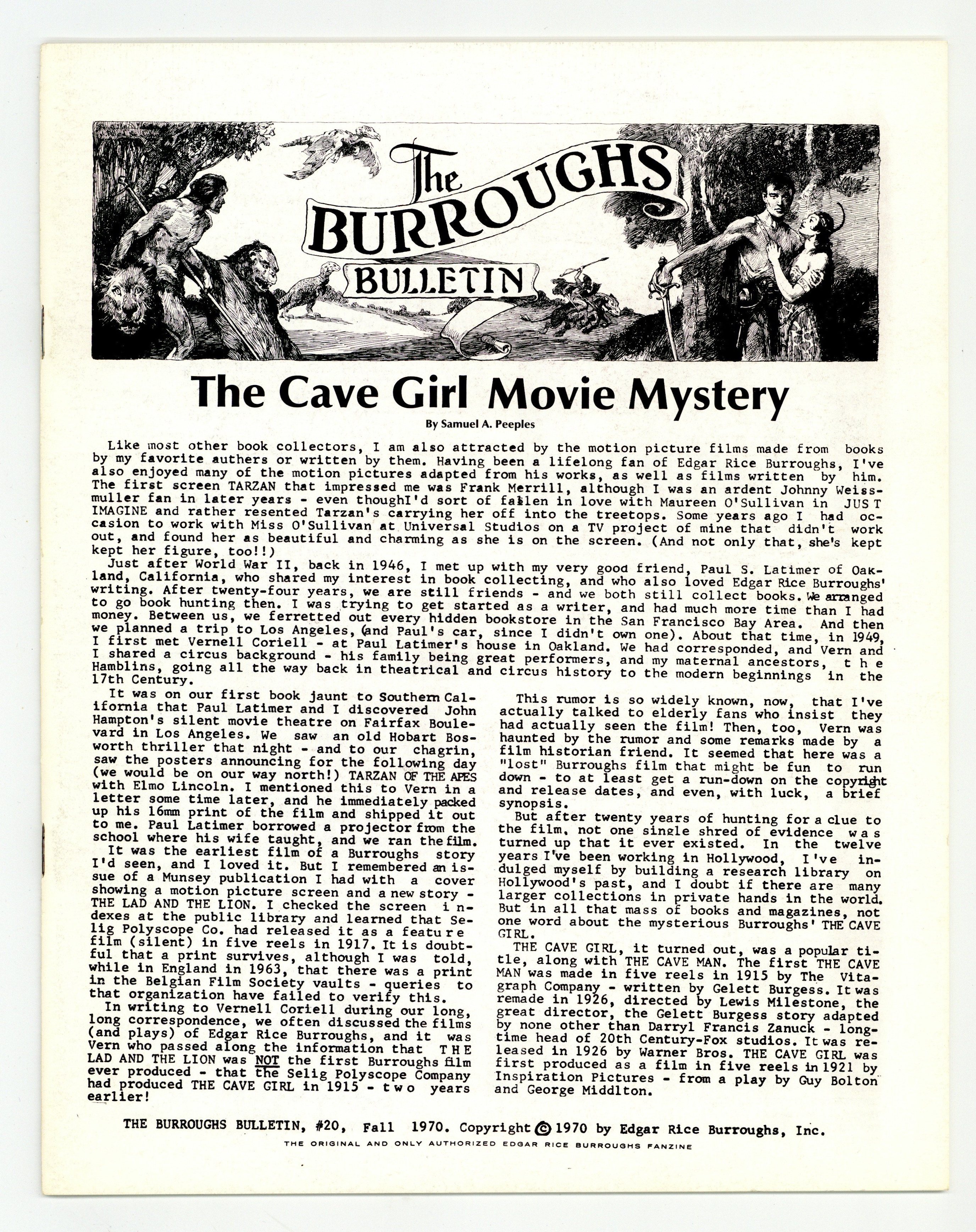 Published 1970 (est.) by Vernell Coriell.$8.00Issue #20 - Fall 1970. Edgar Rice Burroughs Fanzine. "Cave Girl Movie Mystery" by Samuel Peeples, "Across Darkest Africa With the Waziri" by John Harwood, "Nature of Pellucidar's Sun" by Frank Brueckel, "Trailblazer to Pellucidar" by Maurice Gardner, "Pellucidar Encyclopedia" by Allan Howard, "Even Apes Fight For It" by Edgar Rice Burroughs. Art by Roy Krenkel, Larry Hanck, Harry Borgman and Frank Frazetta. 8 1/2-in. x 11-in., 32 pages, black and white.