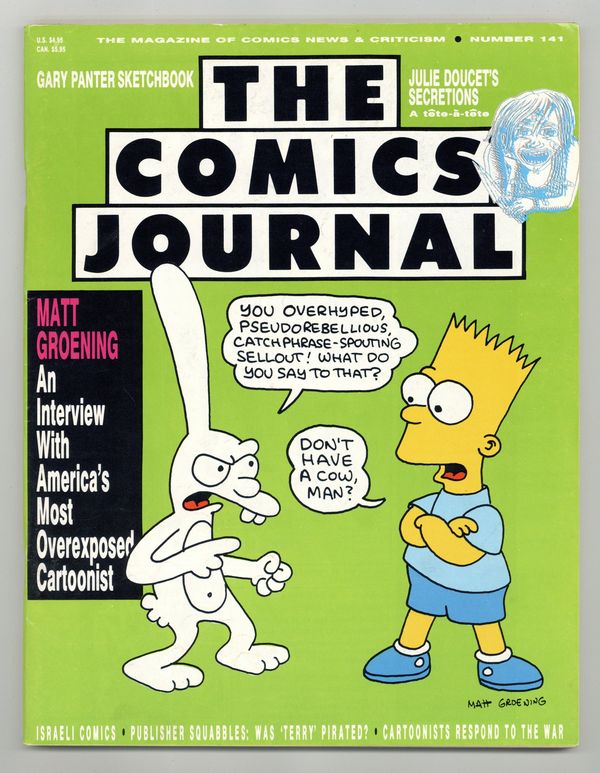 Published May 1991 by Fantagraphics.$15.00Interviews with Matt Groening and Julie Doucet (Dirty Plotte). A Gary Panter sketchbook. Cartoonists respond to the first Gulf War. Plus reviews, comics, letters, and news. Cover by Groening. Black and white. Cover price $4.95.