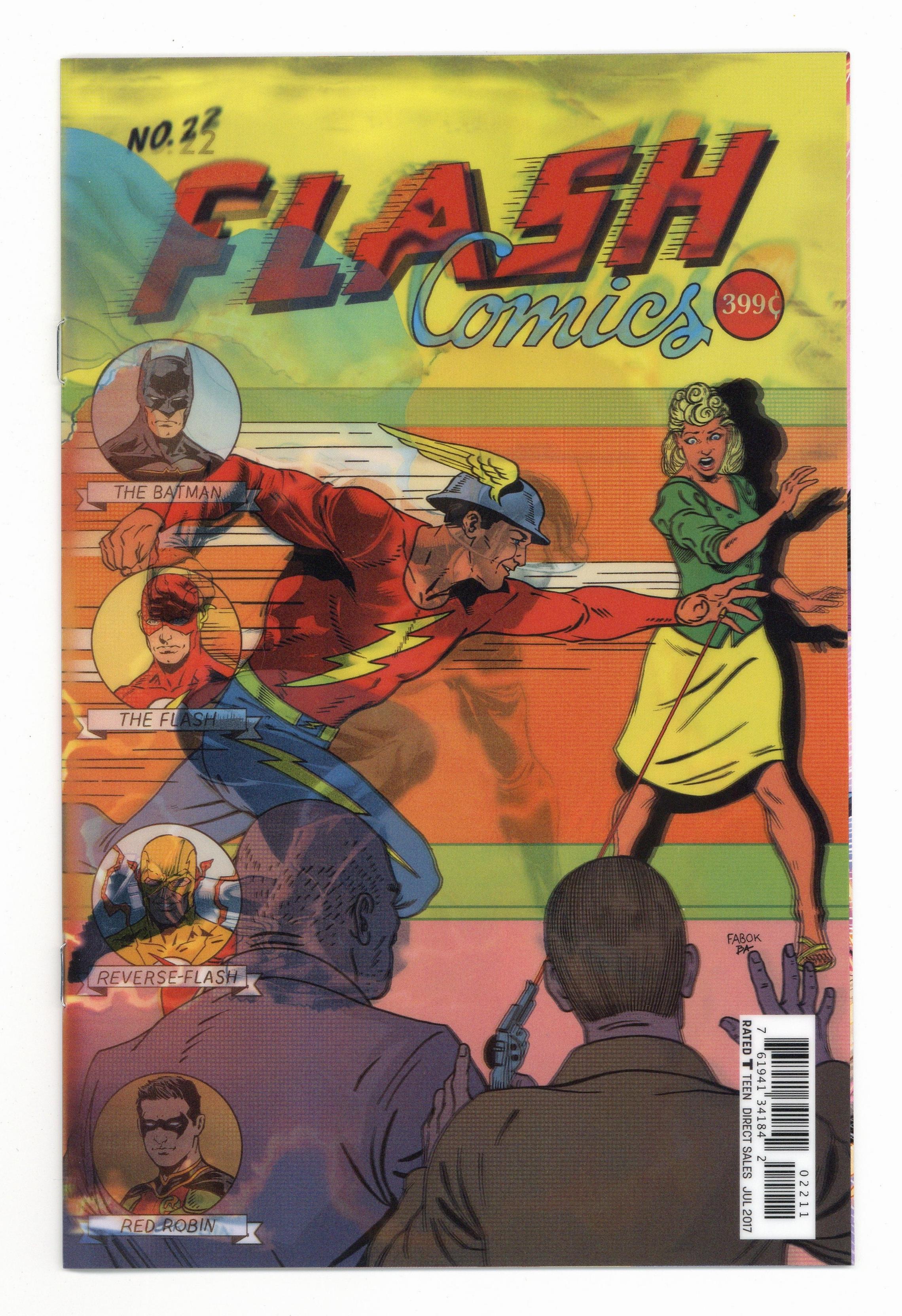 Lenticular Variant Edition. Written by Joshua Williamson. Art by Howard Porter. Cover by Jason Fabok. "THE BUTTON" part four! The cataclysmic events of DC UNIVERSE: REBIRTH #1 continue here! The Dark Knight and The Fastest Man Alive, the two greatest detectives on any world, unite to explore the mystery behind a certain blood-stained smiley button embedded in the Batcave wall. What starts as a simple investigation turns deadly when the secrets of the button prove irresistible to an unwelcome third party-and it's not who anyone suspects! It's a mystery woven through time, and the ticking clock starts here! 32 pages, full color. Rated T Cover price $3.99.