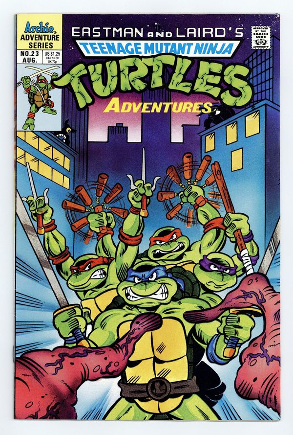 Published Aug 1991 by Archie Publications.$23.00"Search and Destroy" – Script by Dean Clarrain. Art by Chris Allan, Brian Thomas, and Barry Grossman. Cover art: Unknown. The Turtles stop would-be thieves from using a bazooka on an armored car. In Dimension X, Krang is rescued by a mutant turtle named Slash. 32 pgs. Full color. $1.25 cover price. Cover price $1.25.