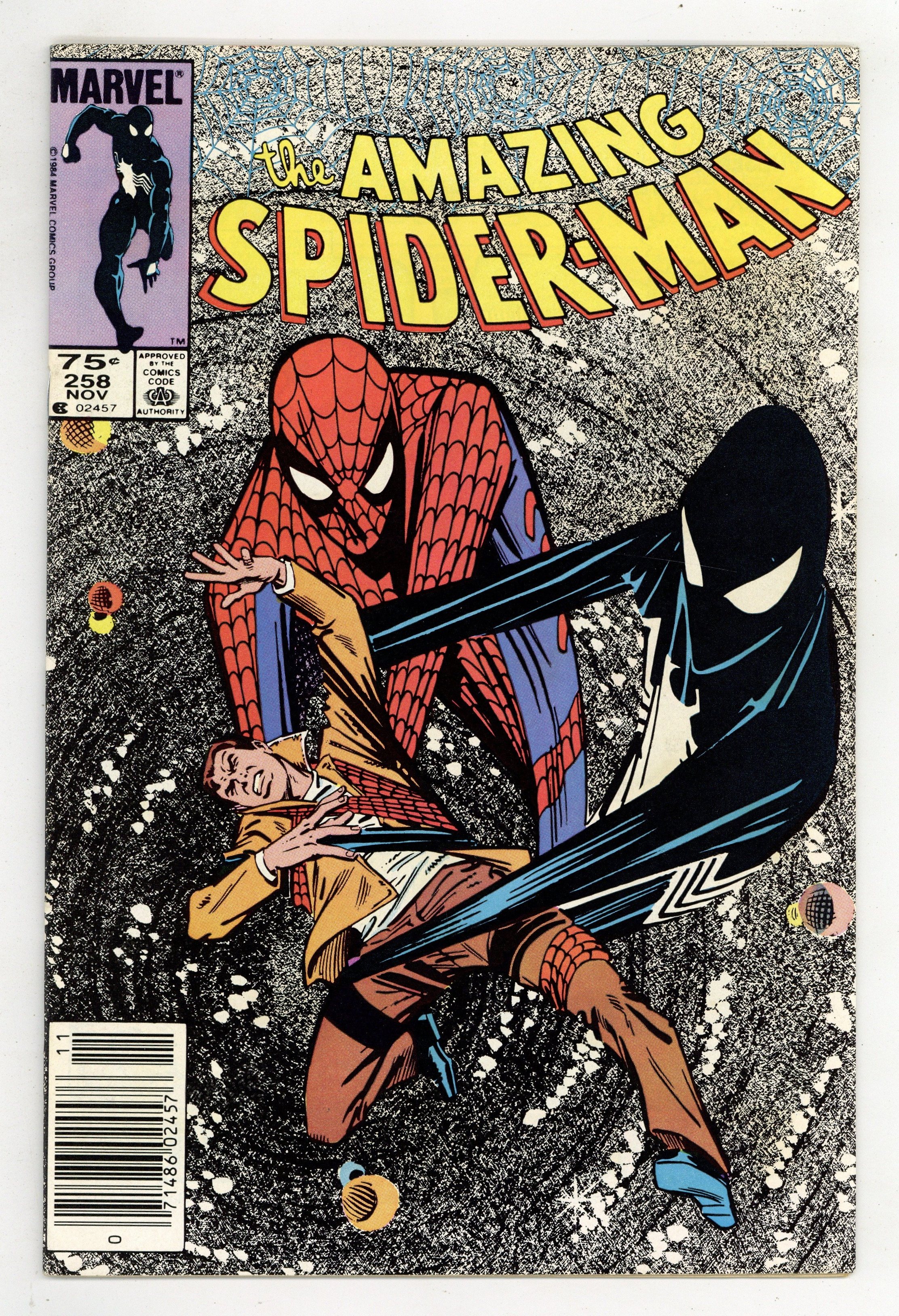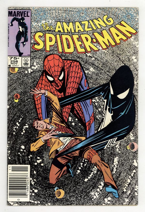 Canadian edition with $0.75 cover price. "The Sinister Secret of Spider-Man's New Costume!" Guest-starring Mr. Fantastic and the Human Torch. Script by Tom DeFalco. Pencils by Ron Frenz. Inks by Joe Rubinstein. Cover by Ron Frenz and Joe Rubinstein. Chaos erupts at 410 Chelsea when Mary Jane Watson and the Black Cat meet inside Peter Parker's apartment! Wow, what a shocking development! To say that the web-slinger has some explaining to do...would be the understatement of the year! After the dust settles, the wall-crawler swings over to the Baxter Building to let Reed Richards analyze his new black costume. When Spider-Man learns his costume is "alive," he tries to pull it off; but the alien symbiote has other ideas! Can the Fantastic Four help Spidey with his major wardrobe malfunction? Cameo appearances by the Rose, Hobgoblin, and Puma. (Notes: The Black Cat and Mary Jane Watson are formally introduced to one another in Spectacular Spider-Man 123. The cover does not display the typical UPC box in the lower left-hand corner. This issue was reprinted in Marvel Tales 272.) 32 pages. Cover price $0.75.