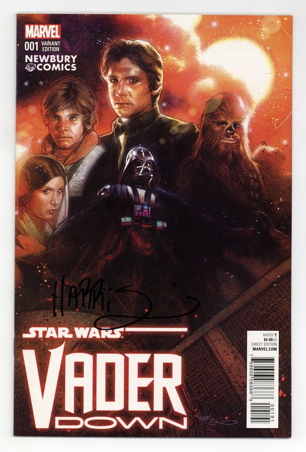 Newbury Comics Variant Cover by Tony Harris. Vader Down: Part 1 of 6 - Written by Jason Aaron. Art by Mike Deodato. When Darth Vader accidentally finds himself facing off against the Rebel Fleet on his own, the rebels will learn the true strength of the Dark Side of the Force! Once Vader crashes on a nearby planet, the Rebellion is willing to risk everything for this once-in-a-lifetime chance to take out one of their biggest enemies! Luke! Vader! Leia! Aphra! Han! Chewie! And all manner of Droid, good and evil! ONE SHOT/Rated T Story continues in Darth Vader #13. ONE SHOT 48 pages, full color, Rated T.